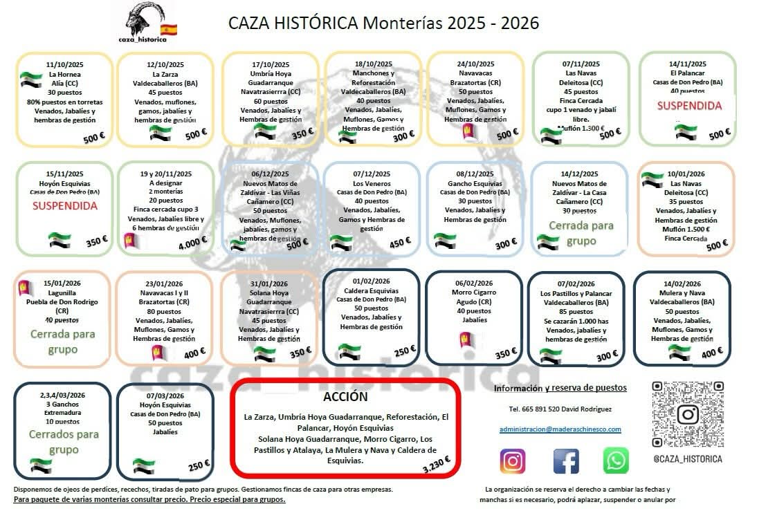 El viernes 23 de enero, Caza Histórica tiene previsto desplazarse a Brazatortas, Ciudad Real, para cazar NAVAVACAS, montería premiada en la pasada edición de los Premios Podenquero por su excelente resultado del pasado año, y que esta temporada volverá a sorprendernos con otro excelente plantel.