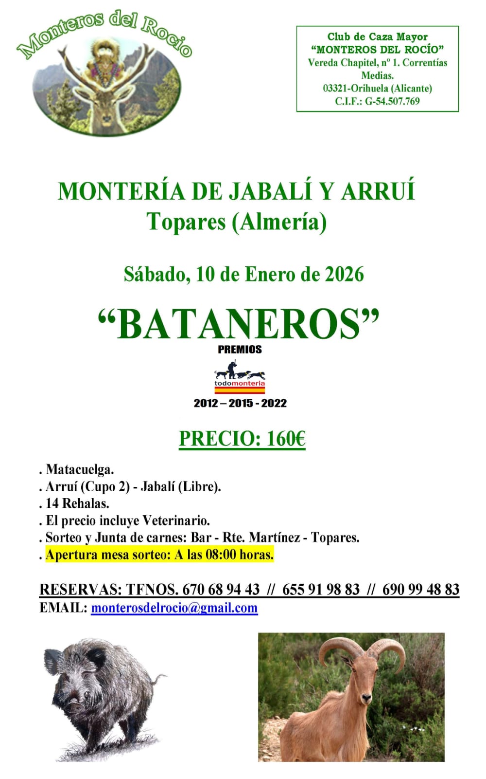 El sábado 10 de enero se monteará BATANEROS, una de las manchas más prestigiosas y laureadas de la organización , galardonada en los Premios Podenquero en los años 2012, 2015 y 2022 por sus excelentes resultados a jabalíes y arruis, y que este año volveremos a cazar con cupo de 2 arruis por puesto y cochinos libres a un precio de 160€.