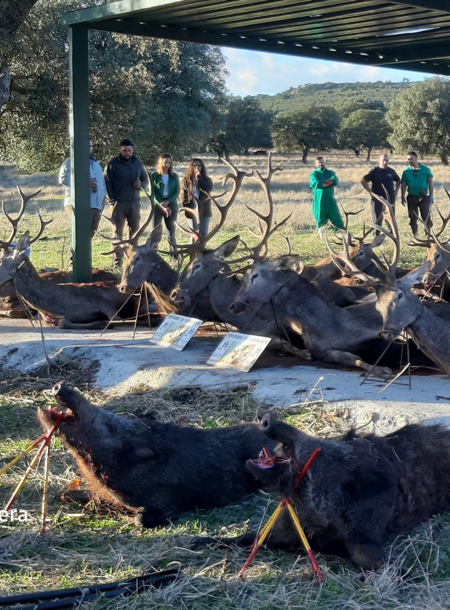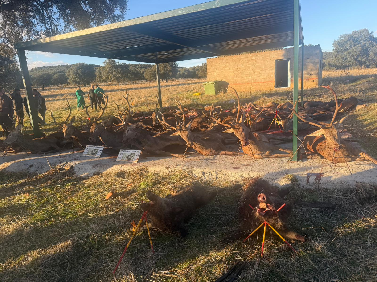 A las 16:30 horas ya se contaba con el plantel completo de la jornada montera, en el que se contabilizaron 22 venados, con un posible bronce, y varios de montería, un total de 23 jabalíes, con dos machos navajeros, y un total de 18 hembras. Resultado algo bajo para la organización, debido a que se había escapado bastante caza sin lances, y también había habido muchos lances infructuosos, ya que se contabilizaron un buen número de cazadores con varios lances a venado y jabalí, y que habían marcado ceros, pero para las próximas monterías en las manchas linderas estarán estos animales.