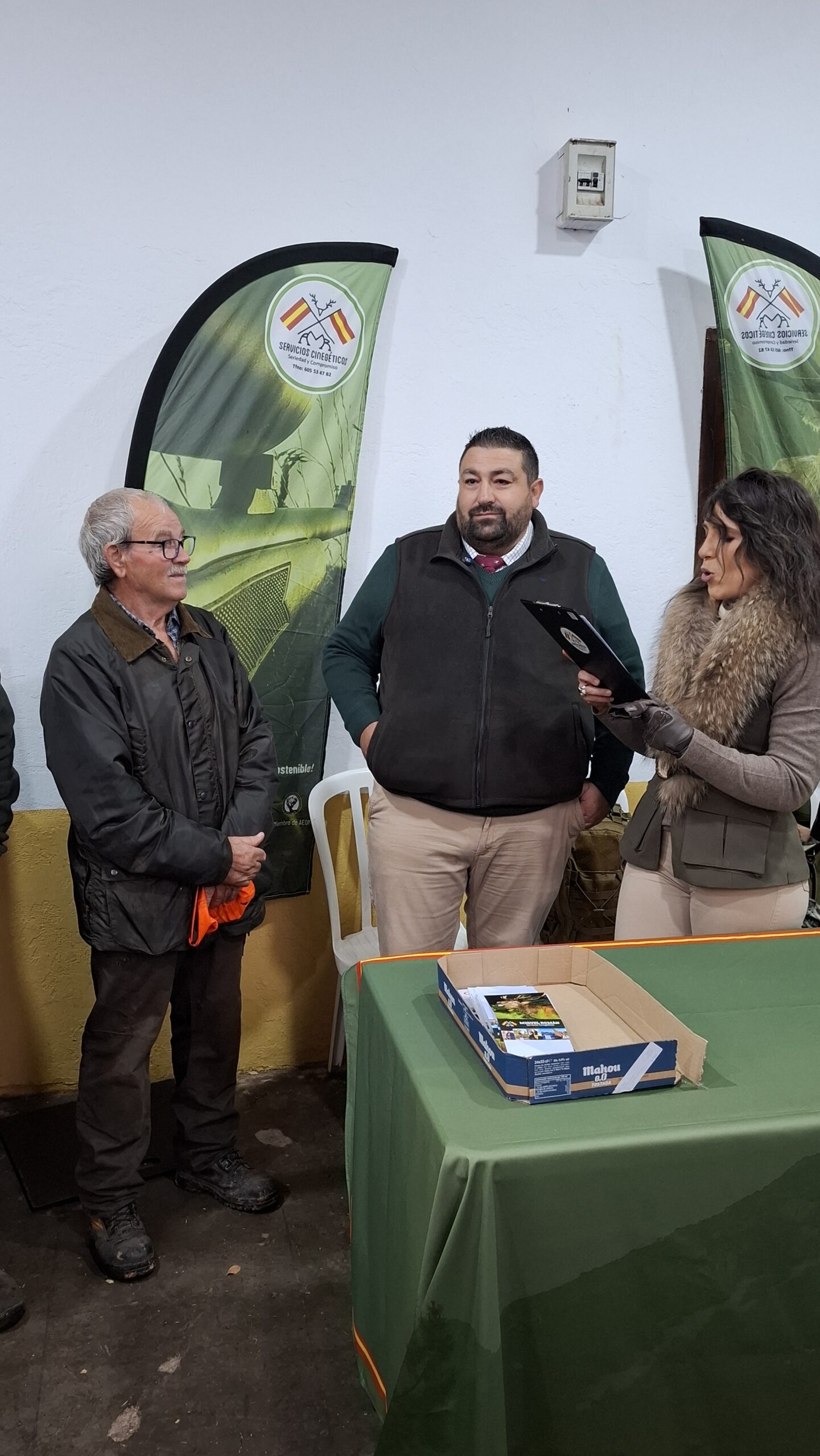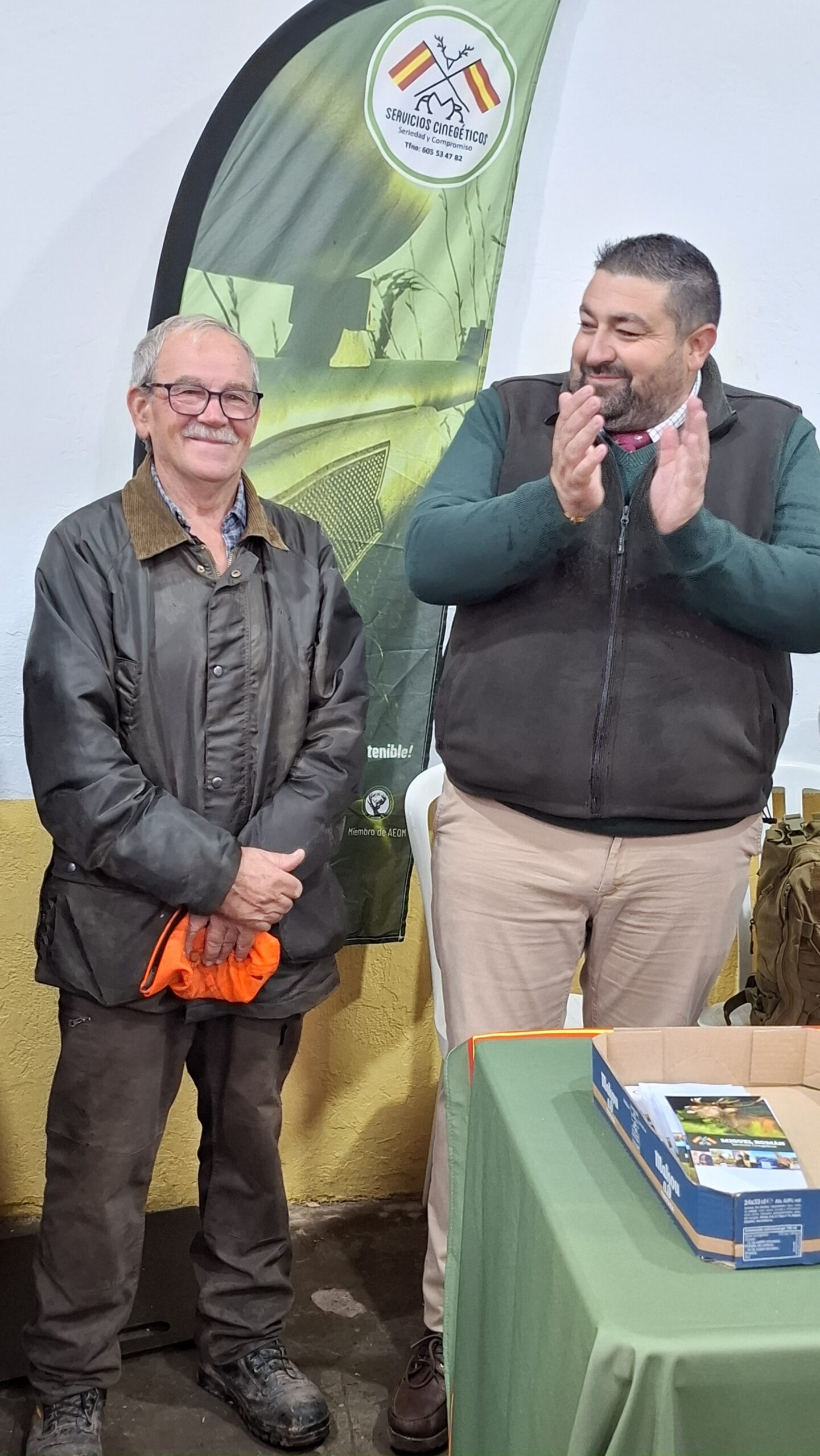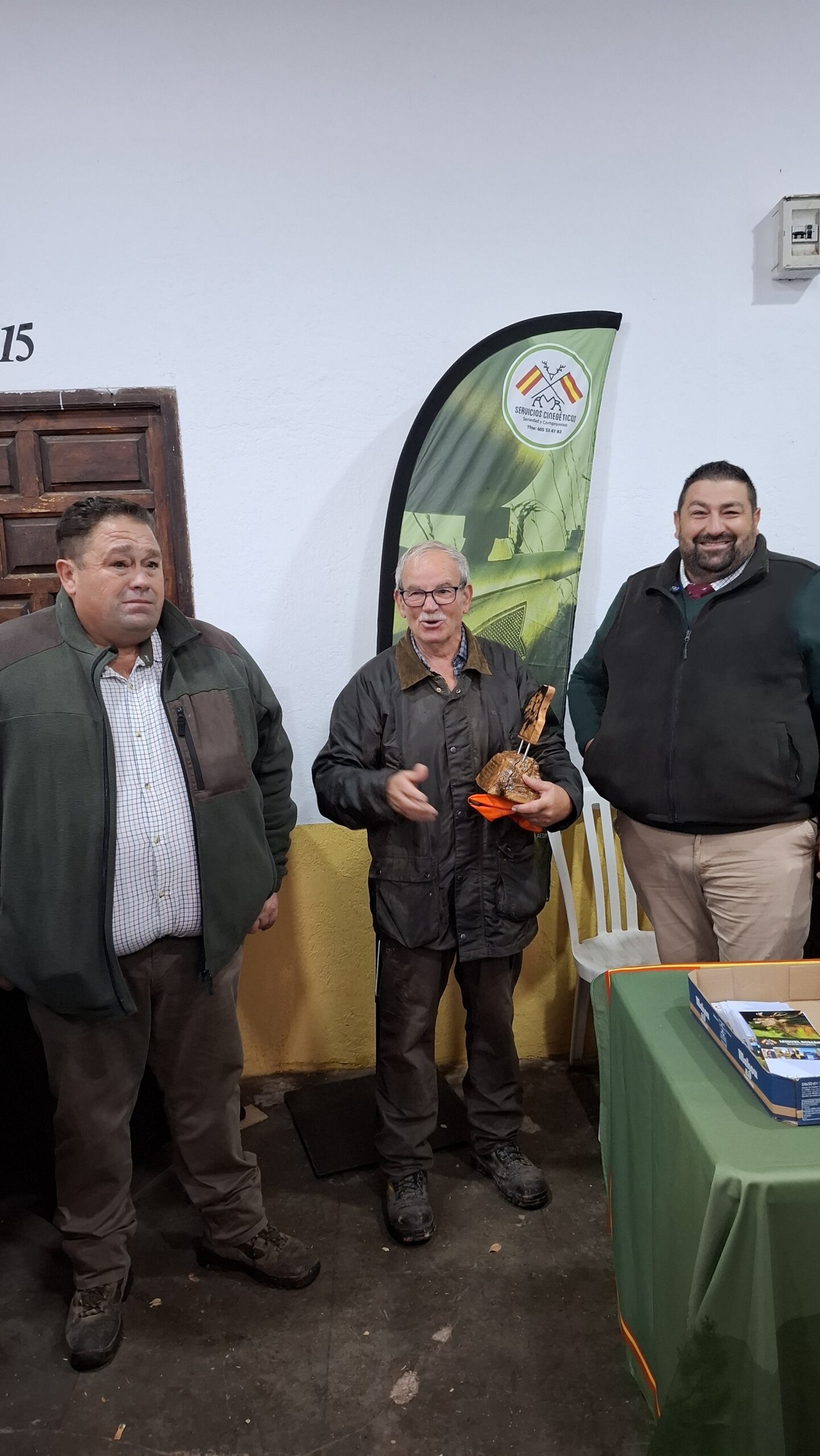 Pero hoy era un día especial para la organización, y no sólo por ser la primera montería de la temporada, sino porque además se le iba a dar un homenaje sorpresa a uno de los rehaleros más veteranos y carismáticos de este país, que tras una vida dedicada al mundo de la rehala y la montería sigue a pie de monte ejerciendo su magisterio, y haciéndonos disfrutar del trabajo de sus perros: el gran Juan Antonio Fernández Fajardo “El Carpintero”, Catedrático de Sierra y Maestro de maestros, que tras unas bonitas palabras de Mª Victoria, esposa de Miguel Román, recibió de este un bonito trofeo como muestra del aprecio y consideración de todos los monteros, rehaleros y de esta organización, que cuida al máximo los detalles, como podemos comprobar. ¡Enhorabuena Juan Antonio! Reconocimiento más que merecido. Y para la organización, otro 10. Estos detalles son los que diferencian a los buenos de los mediocres.