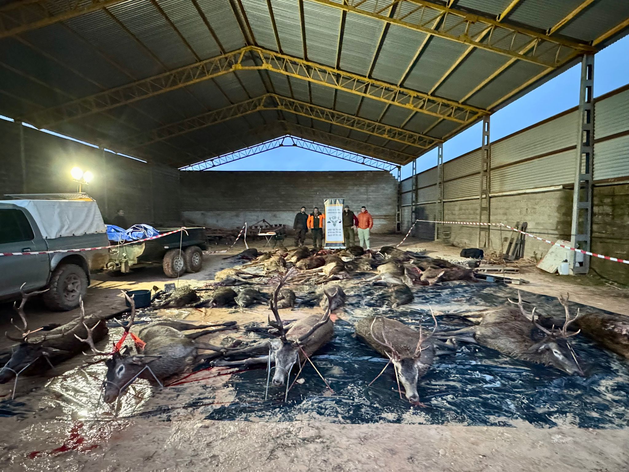 Tras el duro día de caza, y con más de 300 detonaciones contabilizadas, se pudieron juntar en el plantel 6 venados, 20 ciervas y 20 guarros, 2 de ellos con buenas defensas. Del frío que hacía no se pudo colocar bien el plantel, y la imagen que pudimos tomar no reúne toda la caza abatida.