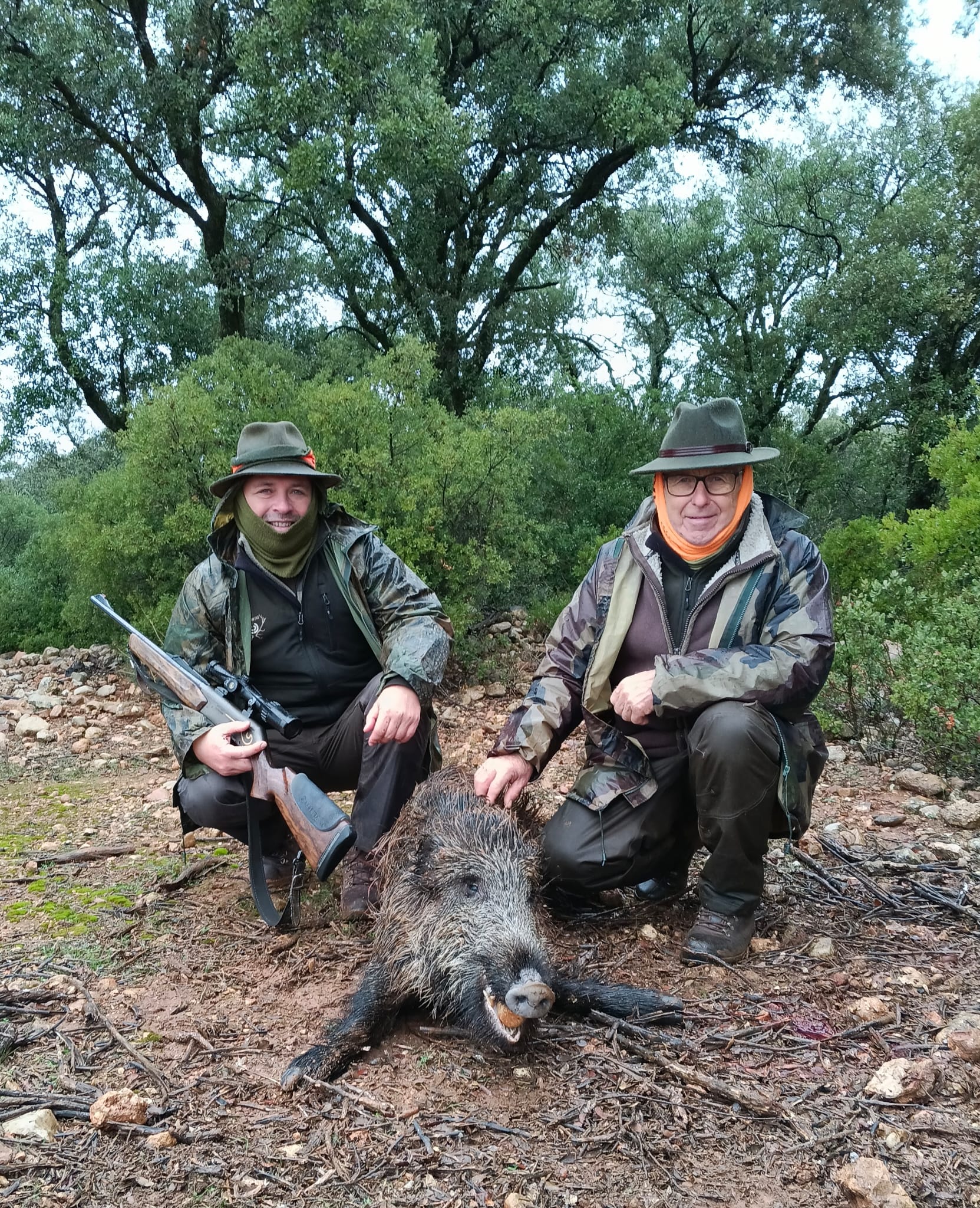 Los puestos terminaron helados y se cortó la montería a las 15:00h. Una pena que la lluvia no diera tregua y que el frío castigara como lo hizo, pues de haber tenido mejor tiempo se abate el doble de caza. Aún así hubo puestos sobresalientes que abatieron hasta 6 jabalíes, y otros muchos que hicieron doblete.