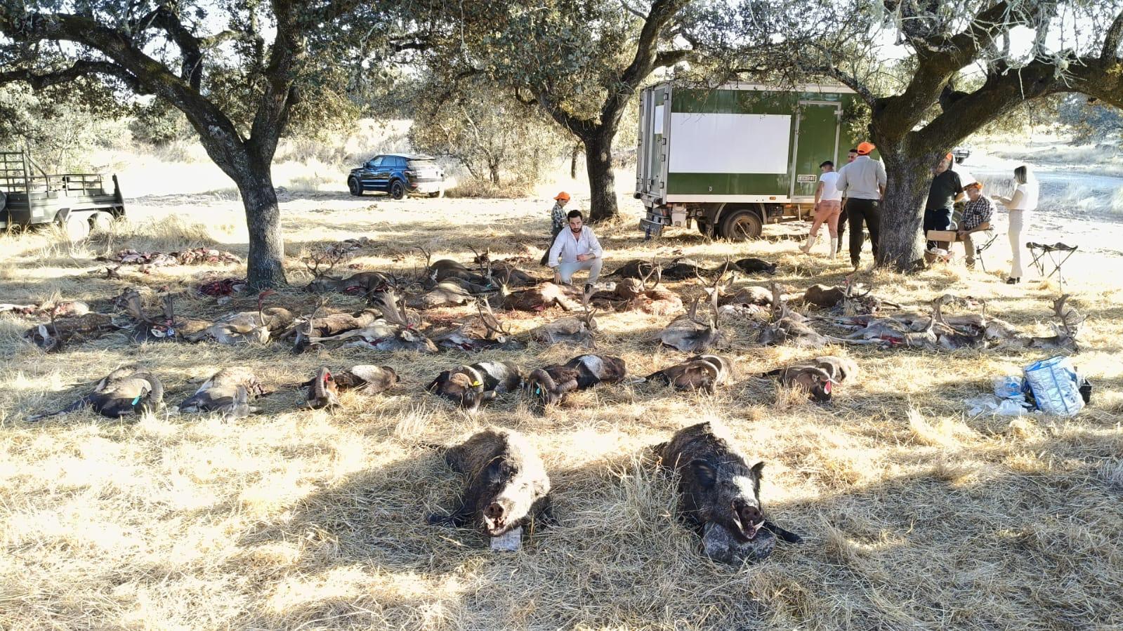Mañana de intenso tiroteo y multitud de lances, que tuvieron a los 40 monteros convocados en máxima tensión y alerta durante toda la batida, alternándose aciertos y fallos, algunos de ellos muy sonoros, como el del puesto que tiró 7 machos errando todos ellos, o el que tiró 6 machos, cobrando sólo una res, hechos tan naturales como los aciertos, terminándose la jornada con un total de 304 disparos contabilizados, lo que se tradujo en un resultado sobresaliente de 64 animales, de los que 44 de ellos eran venados, gamos, muflones y jabalíes, con un impresionante cochino que se ha quedado rozando el oro, y varios trofeos de venado, gamo y muflón de bonita envergadura.