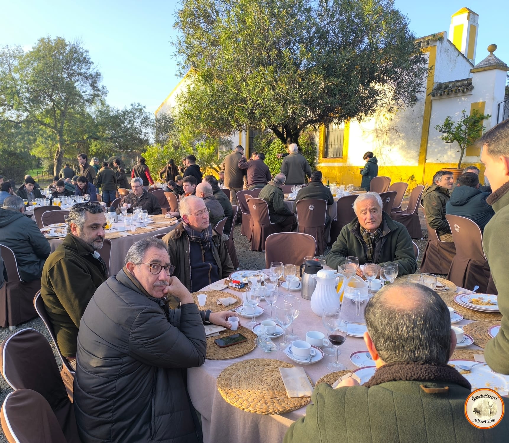 En el precioso cortijo de la finca lindera, fueron recibidos los asistentes a este magno ojeo para sortear y degustar un rico desayuno montero. Allí, en un extraordinario ambiente, el catering Moraima tenía preparadas unas migas exquisitas servidas por su magnífico equipo de camareros y camareras. El sorteo, como es habitual en esta orgánica, se realiza al llegar el montero, cogiendo su papeleta, para acto seguido, pasar a desayunar, cumpliendo la orgánica escrupulosamente la hora de comienzo, no pudiendo coger la papeleta de puesto antes.
