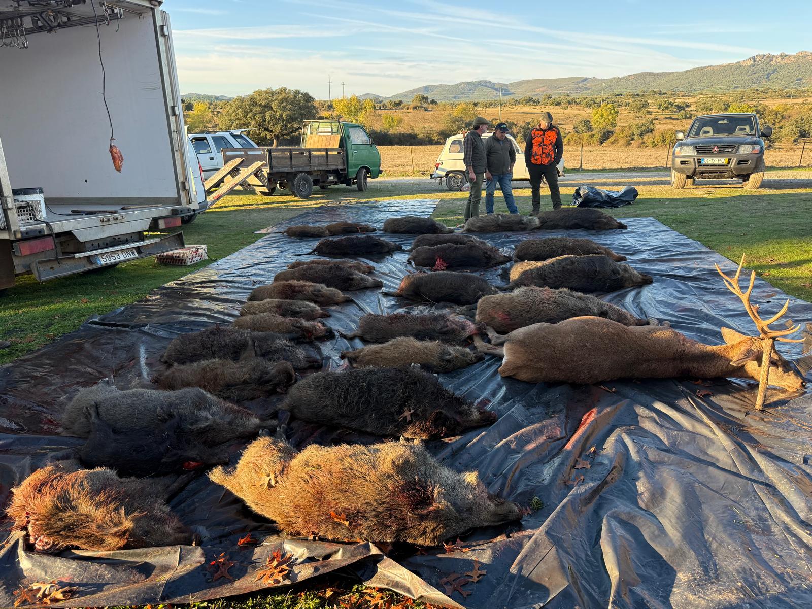 Los monteros fueron citaron a las 8:30h, dando comienzo el sorteo a las 8:45h. Dia soleado con buena temperatura donde las 27 posturas abatieron un total de 28 cochinos cobrados y 1 venado, quedando algunos jabalíes más sin poder recoger por lo complicado del terreno en el que se encontraban.