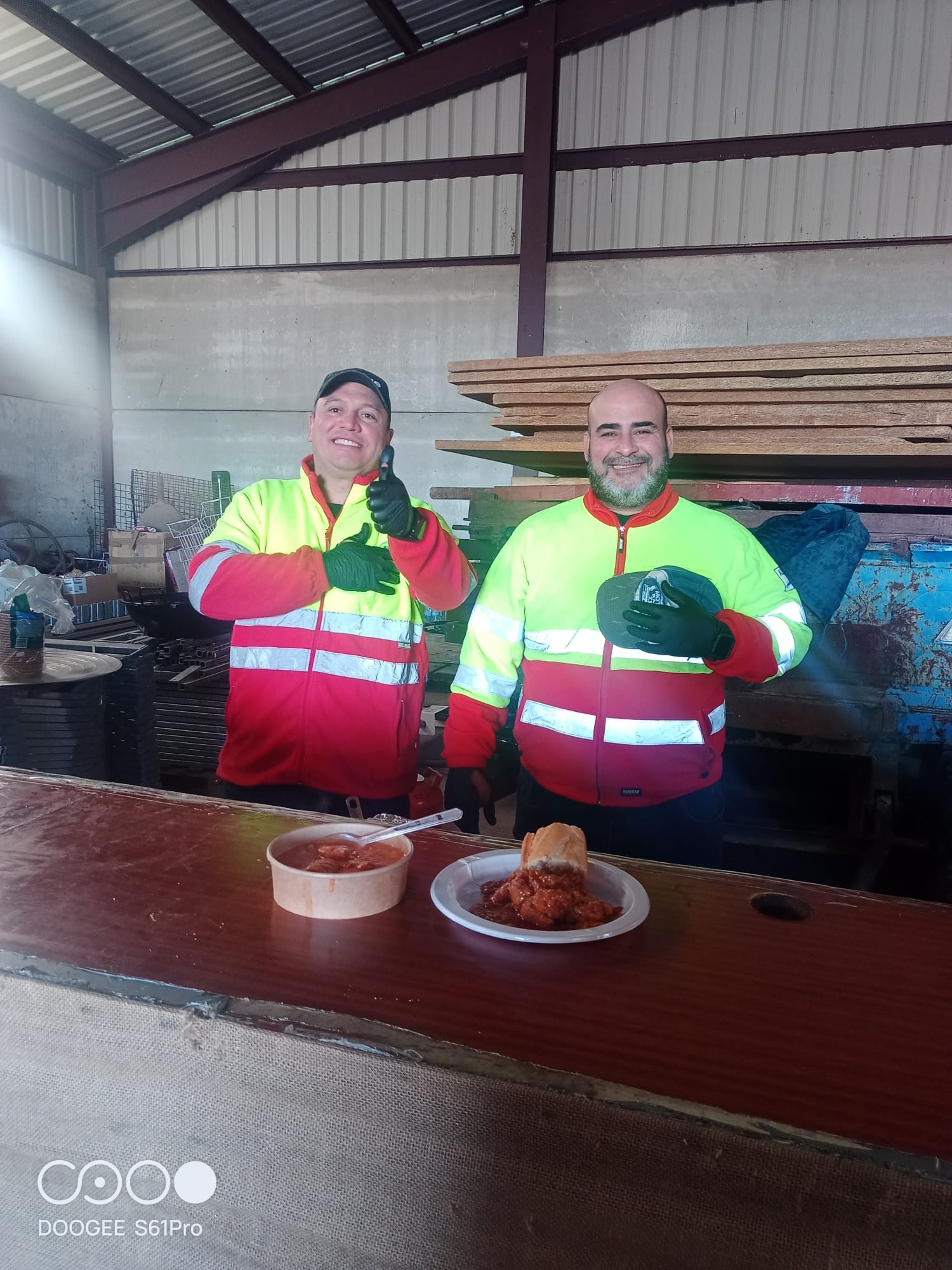 Pasadas las nueve de la mañana, como siempre en la nave del ayuntamiento, desayuno para los 55 monteros y acompañantes; huevos con chorizo, vino, café y bollería. Sorteo de puestos. Algunos regalos; camisetas y gorras de Bigtrophy y bolsas y pulseras de Ferox (gracias Ramón y Asís Valentín Gamazo por el detalle y por hacer del mundo de la caza una gran familia). Se saluda a muchos monteros que igual sólo ves esta vez al año. Pero entrañables. Hay tiempo para abrazos, bromas y cambiar algo de lotería.