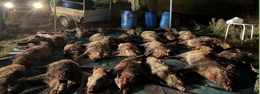 A las tres de la tarde se retiraron los puestos, aunque aún siguieron saliendo jabalíes. Mientras los cazadores se dirigieron a comer al campo de tiro era hora de sacar las capturas. La recogida fue muy trabajosa, por el tamaño de muchos de los cochinos capturados. El resultado final se elevó a la espectacular cifra de 39 jabalíes. Estos fueron trasladados a la Junta de Carnes móvil instalada en el pueblo de Tordelrábano, regresando al campo de tiro ya bien entrada la noche. Una jornada memorable, para el recuerdo. Enhorabuena a todos.