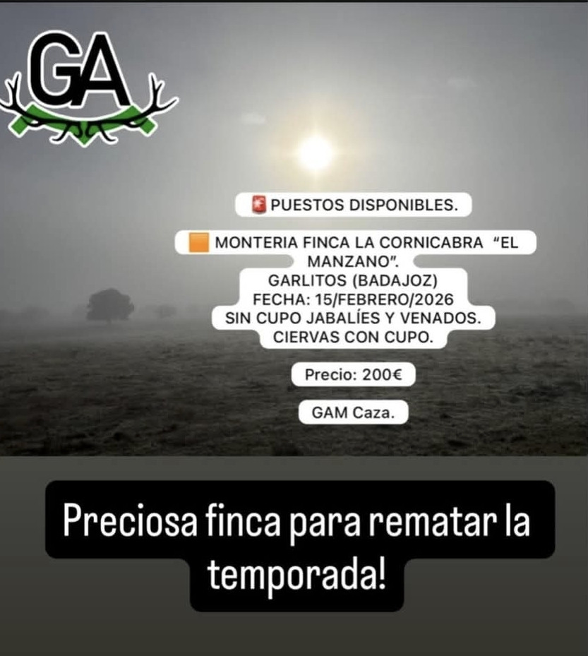 GAM CAZA, la organización capitaneada por Gonzalo Amián, rematará su triunfal temporada el próximo 15 de febrero monteando en Garlitos, Badajoz, la finca LA CORNICABRA, bonito acotado en abierto en el que cazará la mancha El Manzano.