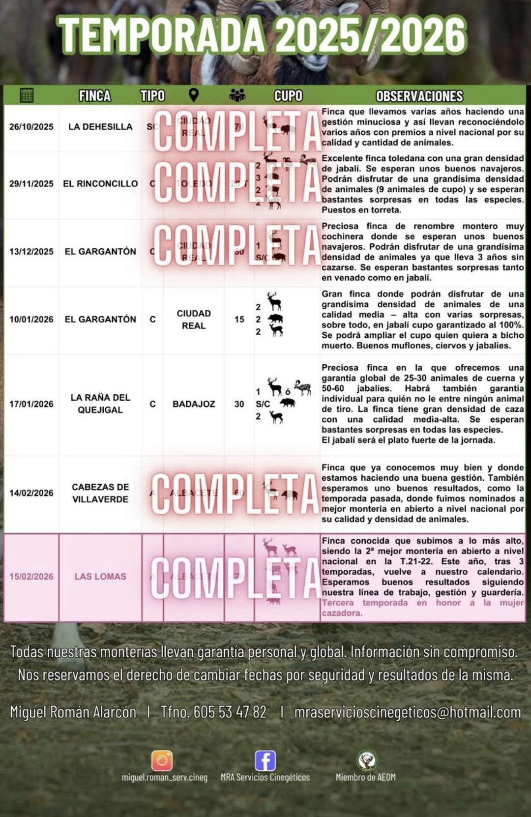Con cinco monterías ya completas y el resto a un 80% de ventas, MRA Servicios Cinegéticos sólo tiene disponibles algunos puestos en las monterías del 10 de enero en EL GARGANTÓN y del 17 de enero en LA RAÑA DEL QUEJIGAL, dos fincas cercadas que van a darnos muchas alegrías, pues son fincas muy contrastadas con gran densidad de caza y bonitos trofeos.