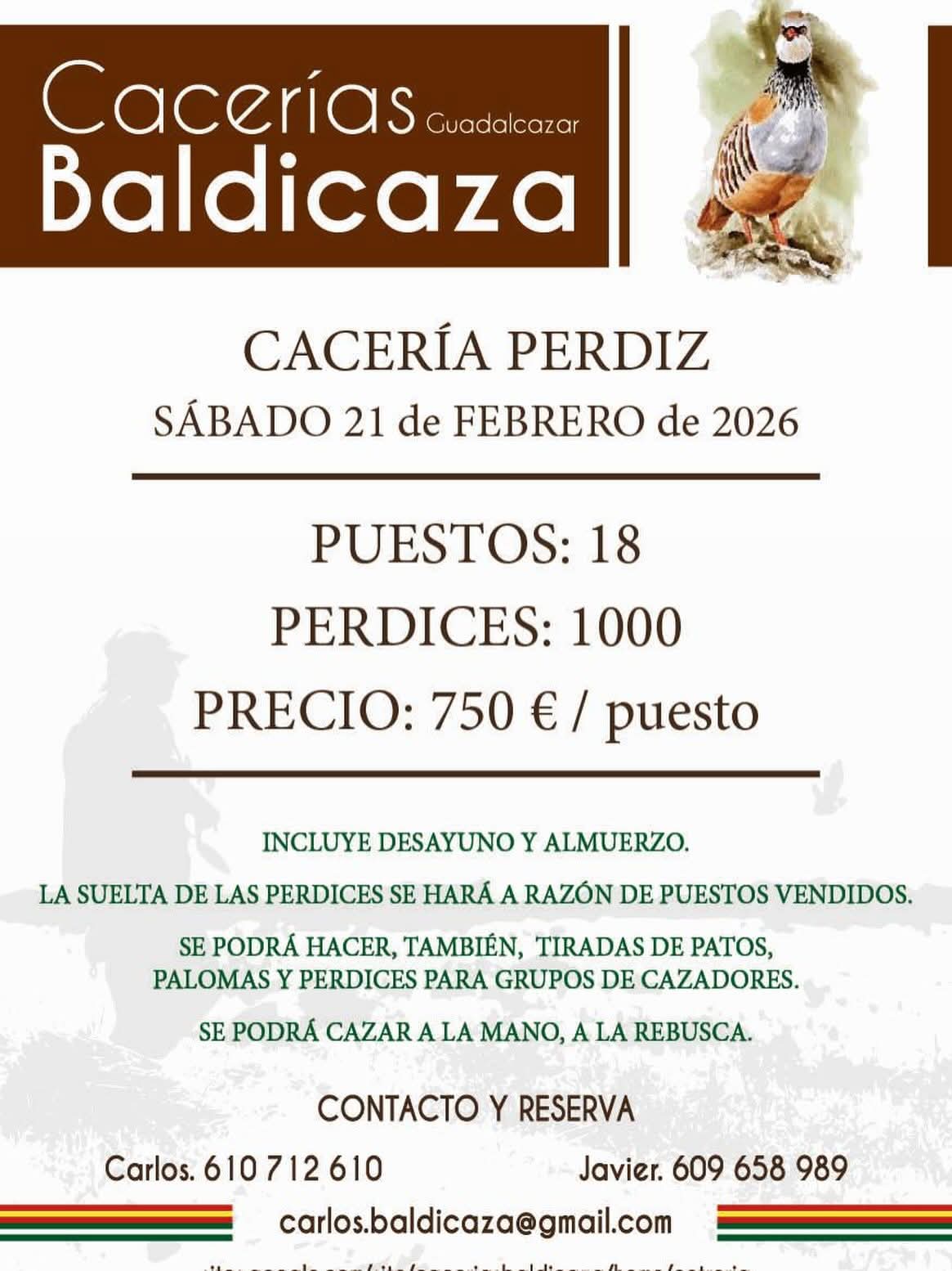 Con más de una década de experiencia y miles de perdices ofertadas en sus afamadas tiradas cada temporada, BALDICAZA se caracteriza por la bravura de sus pájaros y la excelente organización de sus jornadas, resultando todas ellas muy satisfactorias para los cazadores que participan en ellas, repitiendo todos ellos año tras año.