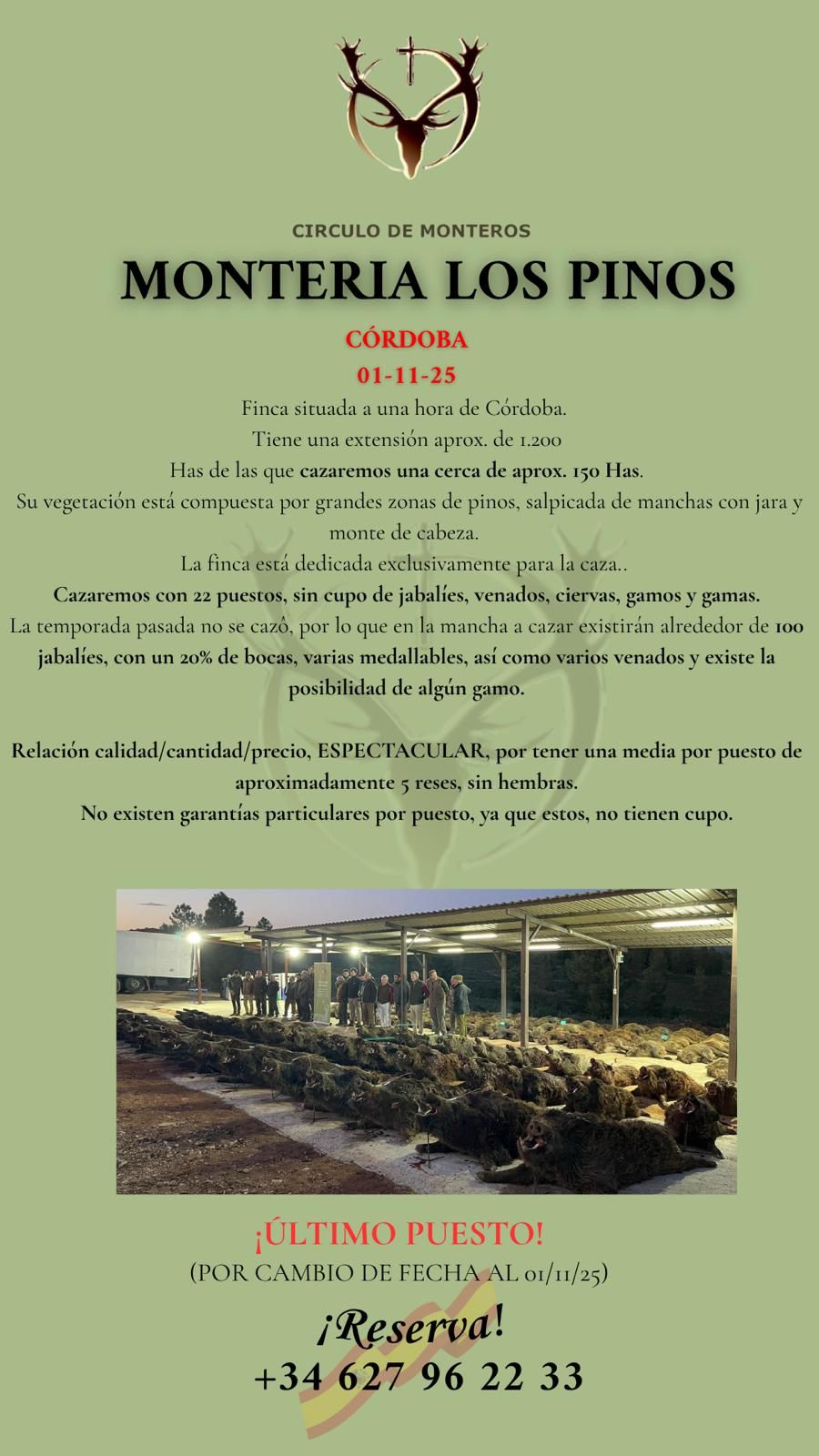 Por baja de última hora, CÍRCULO DE MONTEROS dispone de UN PUESTO para esta espectacular montería que se celebrará el 1 de noviembre en la finca LOS PINOS, Córdoba.