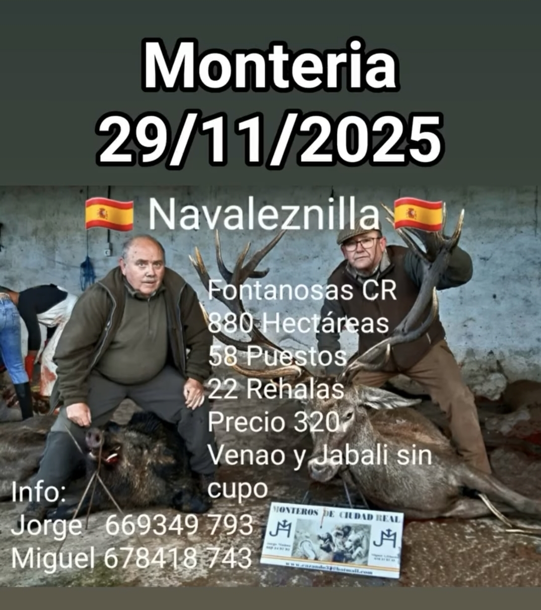 Tras el éxito este pasado sábado en Los Cerros de la Casa, https://todomonteria.com/cronica-cerros-de-la-casa-monteros-de-ciudad-real-2/ Monteros de Ciudad Real pone a la venta los últimos puestos de la finca vecina, Navaleznilla, mancha que se cazará el 29 noviembre a cupo libre de venado y jabalí.