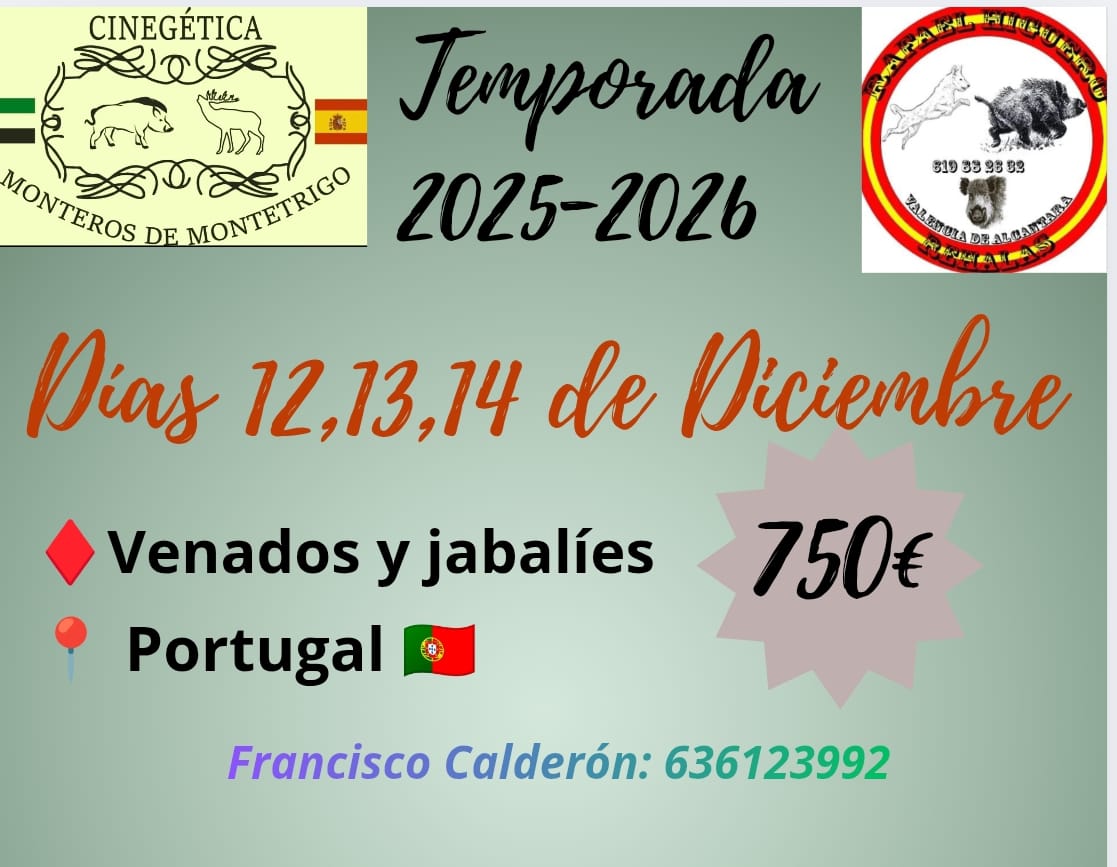CINEGÉTICA MONTEROS DE MONTETRIGO & JOAQUÍN MOREIRA nos ofrecen tres apasionantes días de montería en Portugal para el 12, 13 y 14 de diciembre por tan solo 750 €. Día 12 de diciembre, será una montería mixta de 40 puestos, por 300 €. Es una mancha muy buena, tanto de venados como de jabalíes.Día 13 […]