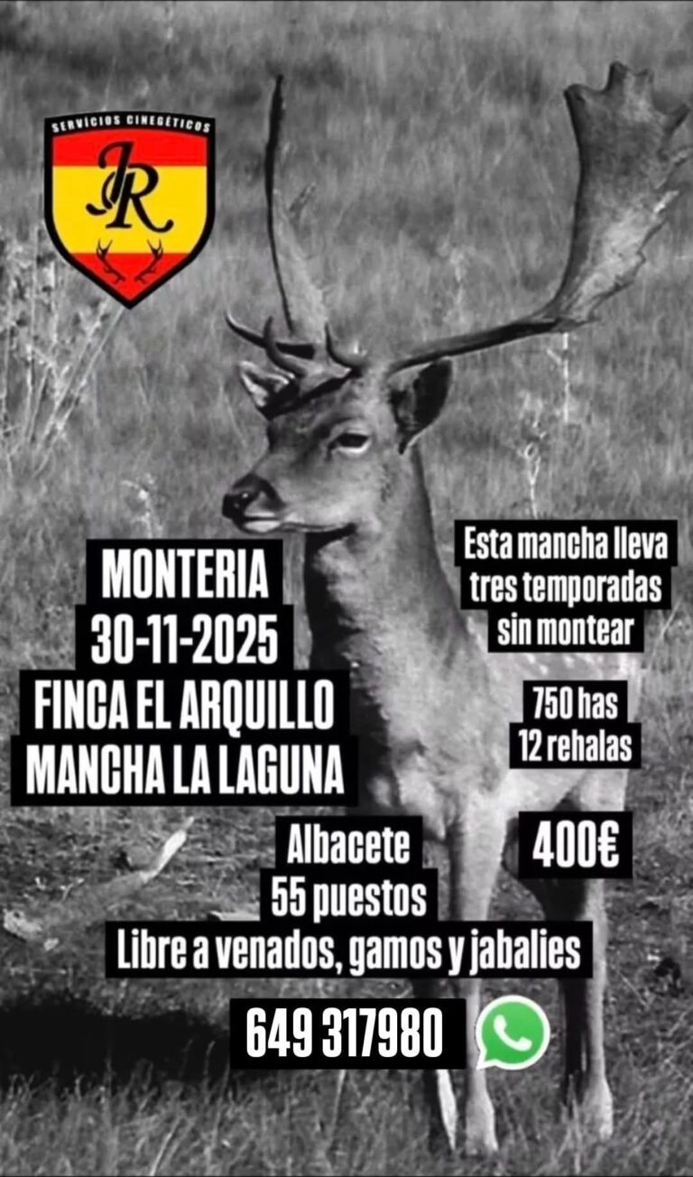 | 14/2/2026 | ![]() | ALBACETE | EL ARQUILLO | A | ![]() | SERVICIOS CINEGÉTICOS JR | 45 | J/V/G/Cva/Gma | S/C | 380 | Más info 689654327 |