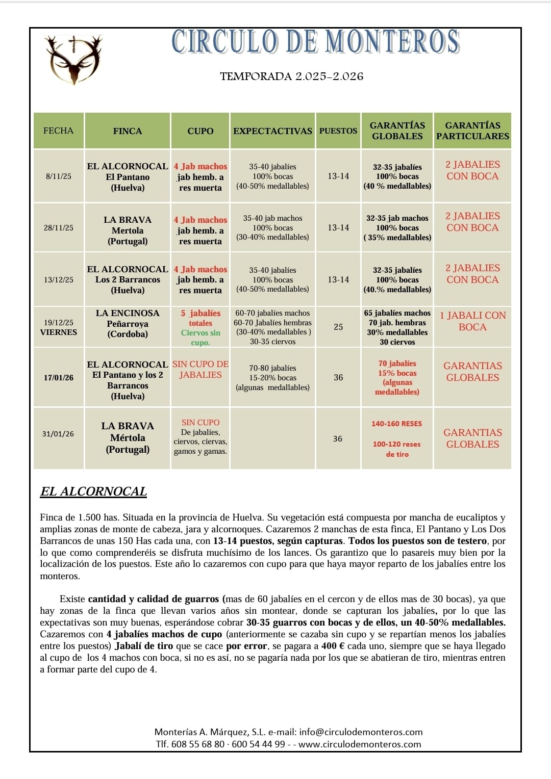 Como veis, el calendario 2025-2026 de Círculo de Monteros tiene argumentos de peso para apostar por él y echar una temporada de ensueño. Consulta sin compromiso.