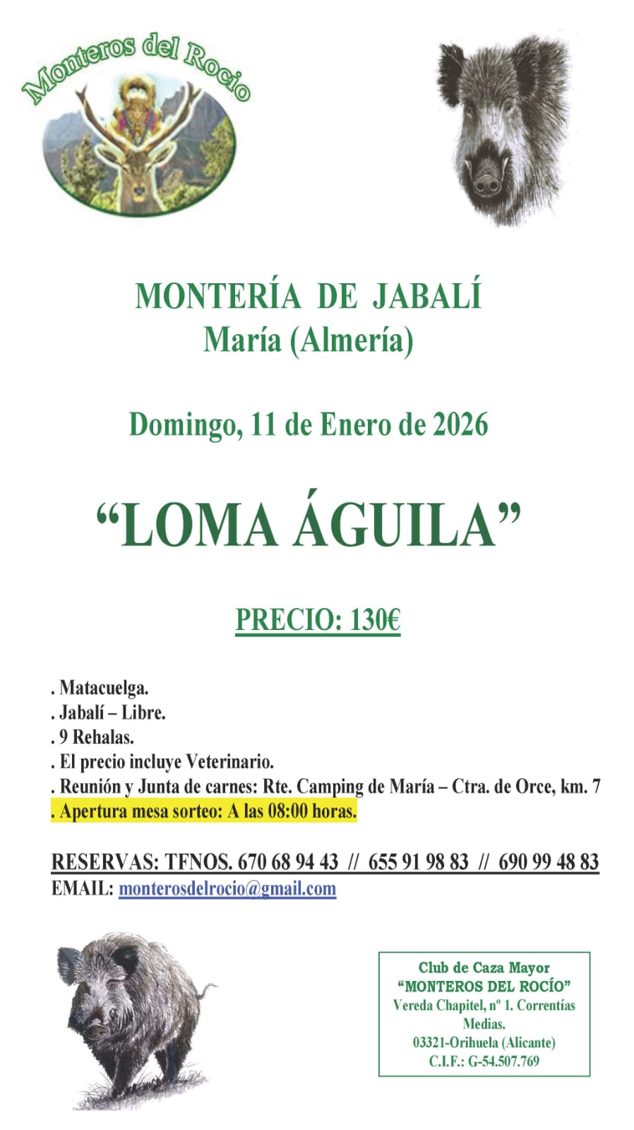Al día siguiente, el domingo 11 de enero, para rematar este primer fin de semana montero por Topares y Sierra María, montearemos a jabalíes LOMA ÁGUILA, otra divertida mancha que siempre nos sorprende con algunos puestos de infarto y varios navajeros de categoría. Se caza también a matacuelga, como siempre, y el precio de la montería es de 130€.