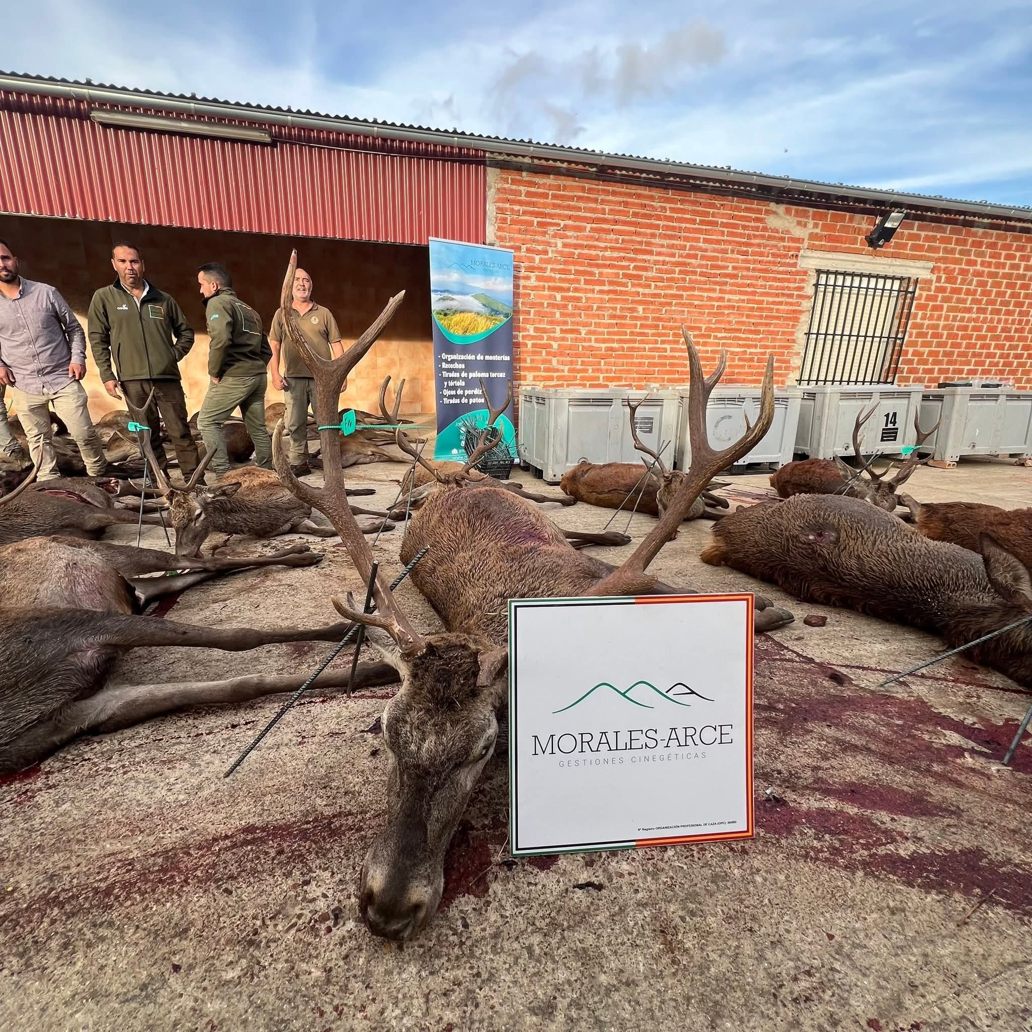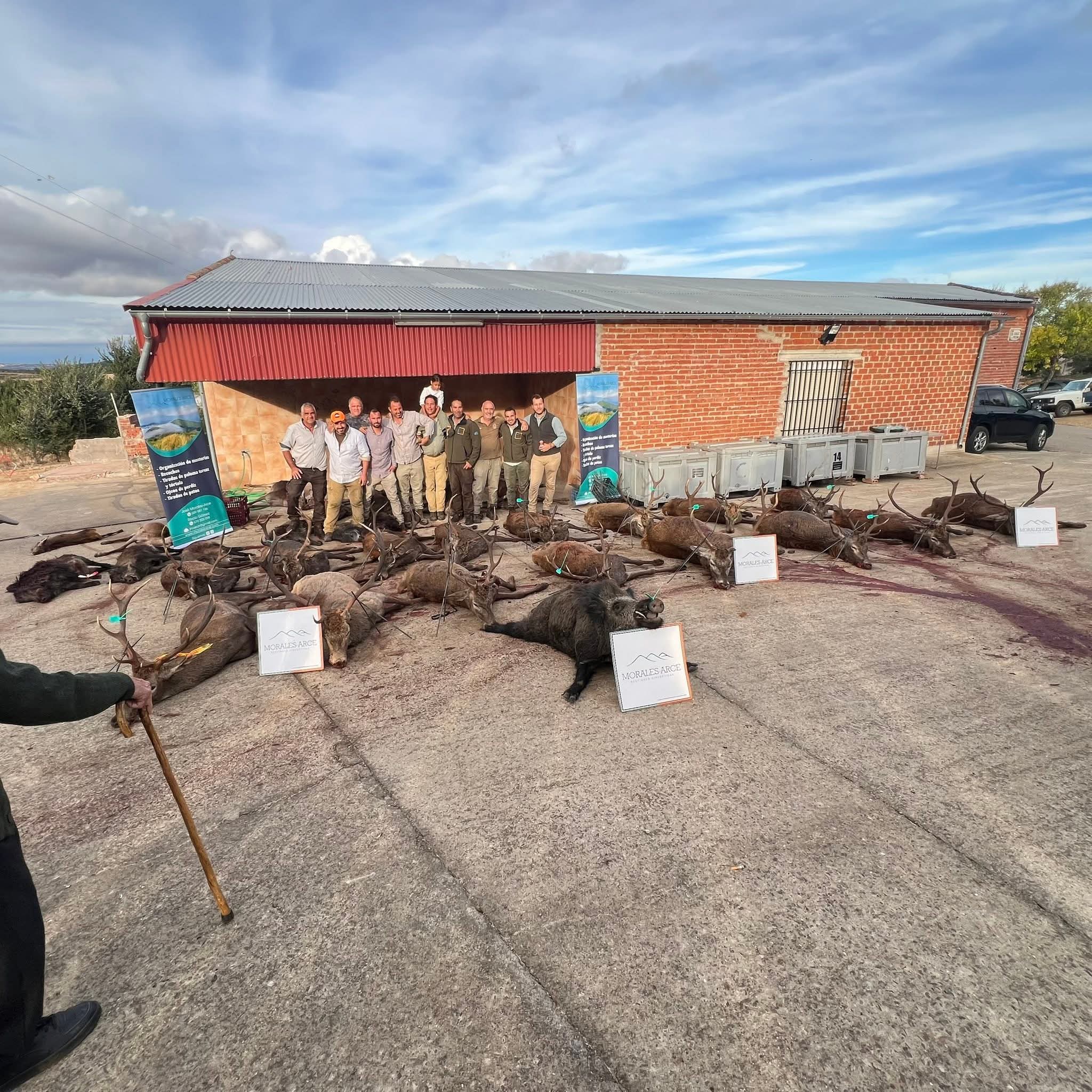 Resultado final después de aparecer un venado esta mañana: 18 venados (uno para medir + otro bonito de montería), 21 jabalíes de tiro + 3 de agarre, con 7 navajeros, y 10 ciervas de gestión.