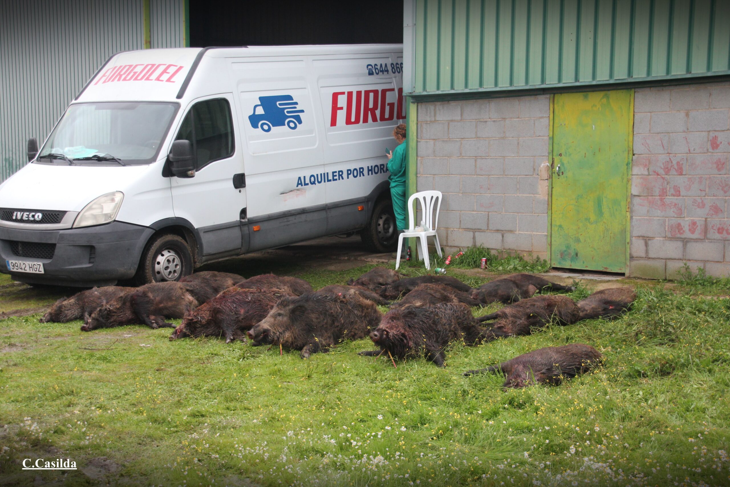 La comida, casi se podría decir que se convirtió en cena, con quince jabalíes en la puerta del primer “viaje” de reses que acudieron.