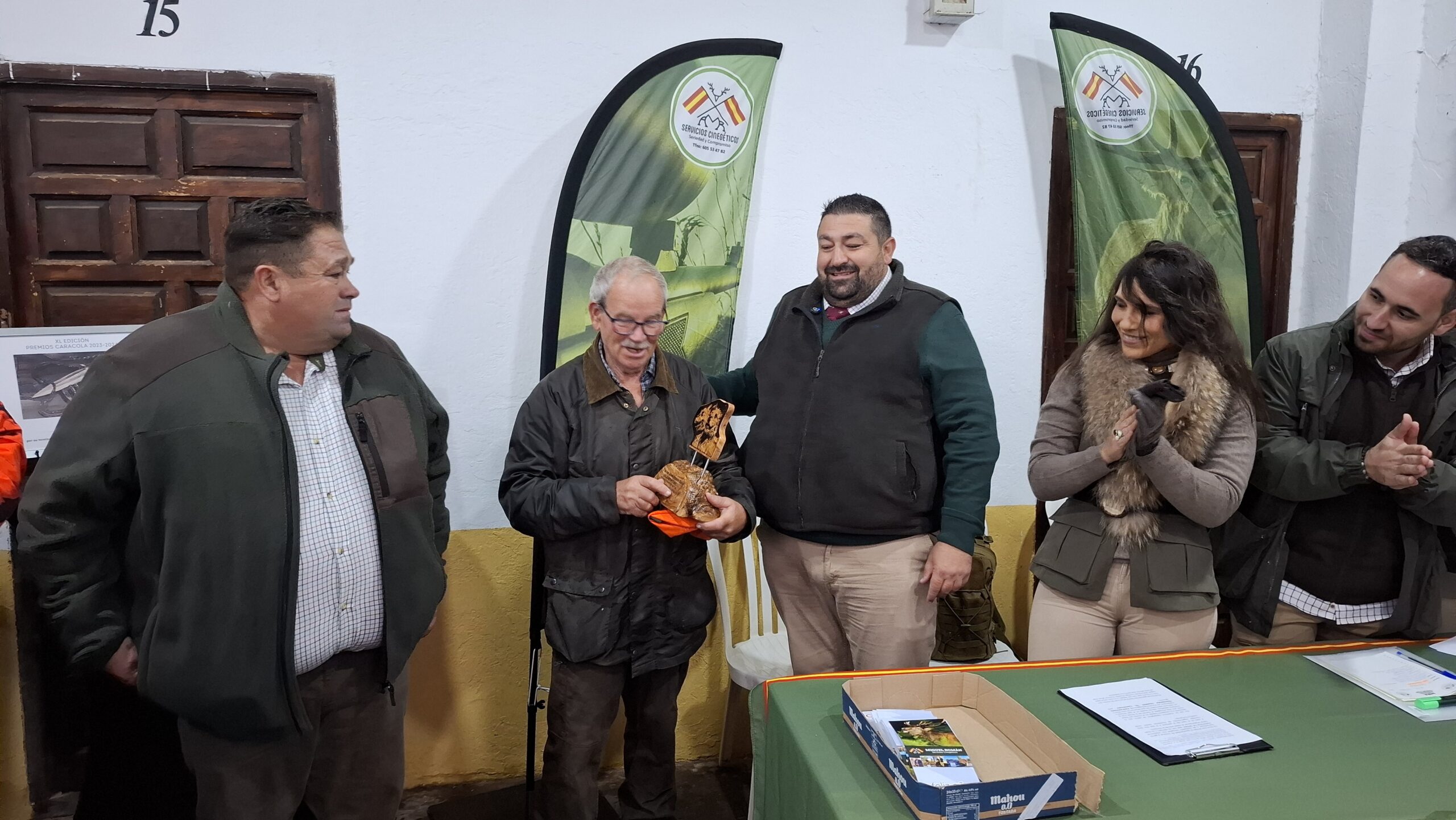 Pero hoy era un día especial para la organización, y no sólo por ser la primera montería de la temporada, sino porque además se le iba a dar un homenaje sorpresa a uno de los rehaleros más veteranos y carismáticos de este país, que tras una vida dedicada al mundo de la rehala y la montería sigue a pie de monte ejerciendo su magisterio, y haciéndonos disfrutar del trabajo de sus perros: el gran Juan Antonio Fernández Fajardo “El Carpintero”, Catedrático de Sierra y Maestro de maestros, que tras unas bonitas palabras de Mª Victoria, esposa de Miguel Román, recibió de este un bonito trofeo como muestra del aprecio y consideración de todos los monteros, rehaleros y de esta organización, que cuida al máximo los detalles, como podemos comprobar. ¡Enhorabuena Juan Antonio! Reconocimiento más que merecido. Y para la organización, otro 10. Estos detalles son los que diferencian a los buenos de los mediocres.