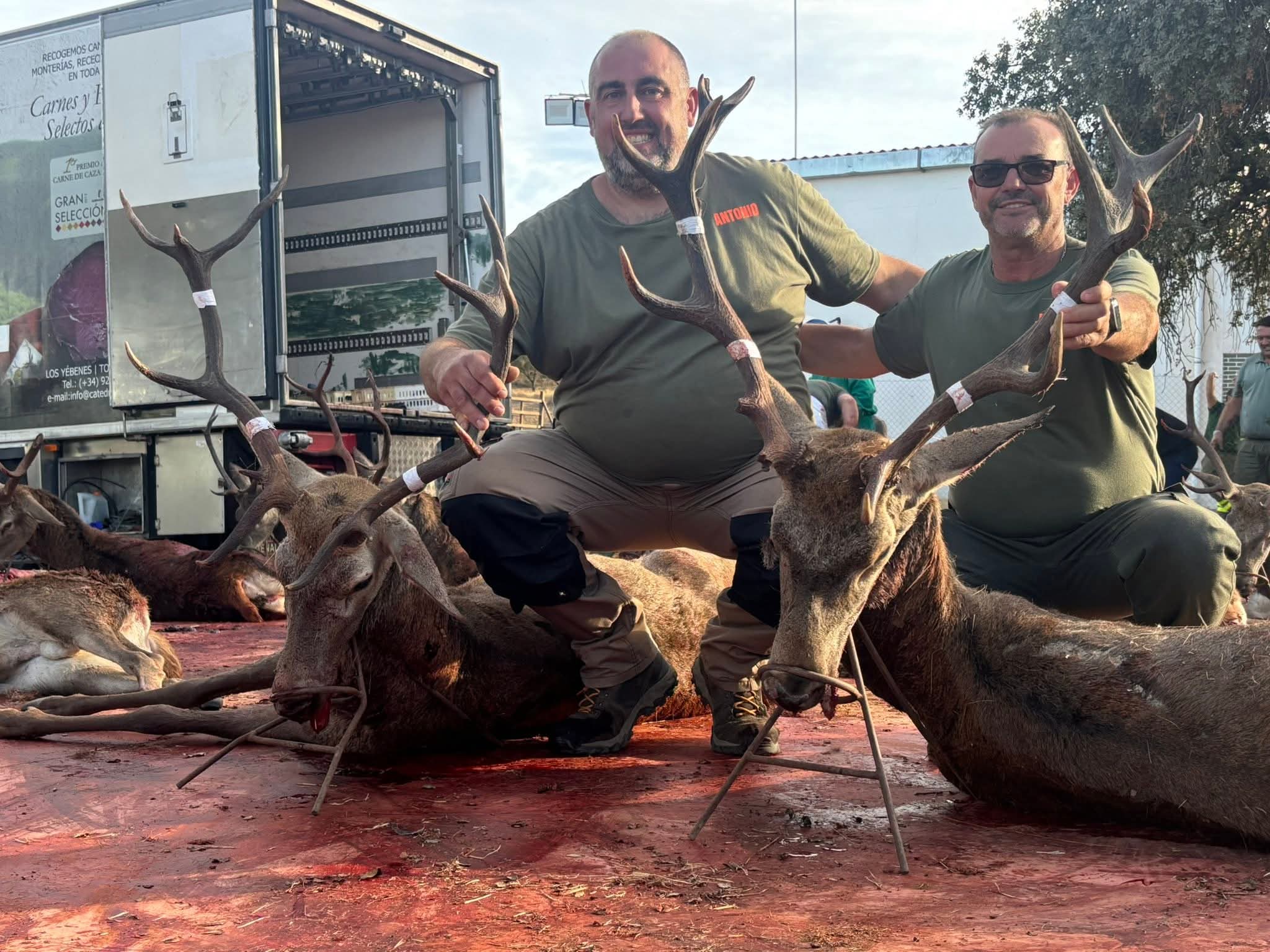 Al final de la jornada, tras un día de intenso tiroteo, se formó un plantel de 46 venados, 12 jabalíes y medio centenar de ciervas, destacando algunos trofeos bonitos de montería en la primera fila del plantel.