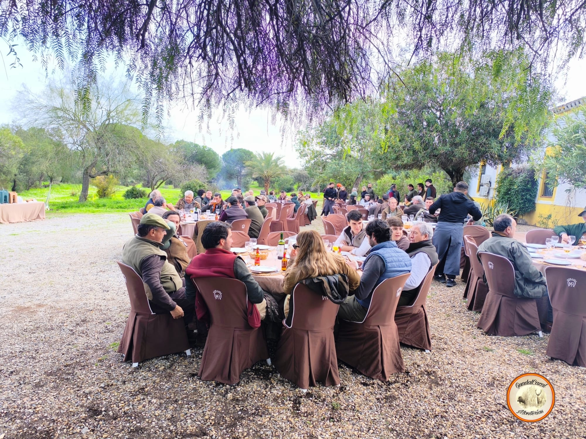 En el precioso cortijo de la finca lindera, fueron recibidos los asistentes a este magno ojeo para sortear y degustar un rico desayuno montero. Allí, en un extraordinario ambiente, el catering Moraima tenía preparadas unas migas exquisitas servidas por su magnífico equipo de camareros y camareras. El sorteo, como es habitual en esta orgánica, se realiza al llegar el montero, cogiendo su papeleta, para acto seguido, pasar a desayunar, cumpliendo la orgánica escrupulosamente la hora de comienzo, no pudiendo coger la papeleta de puesto antes.