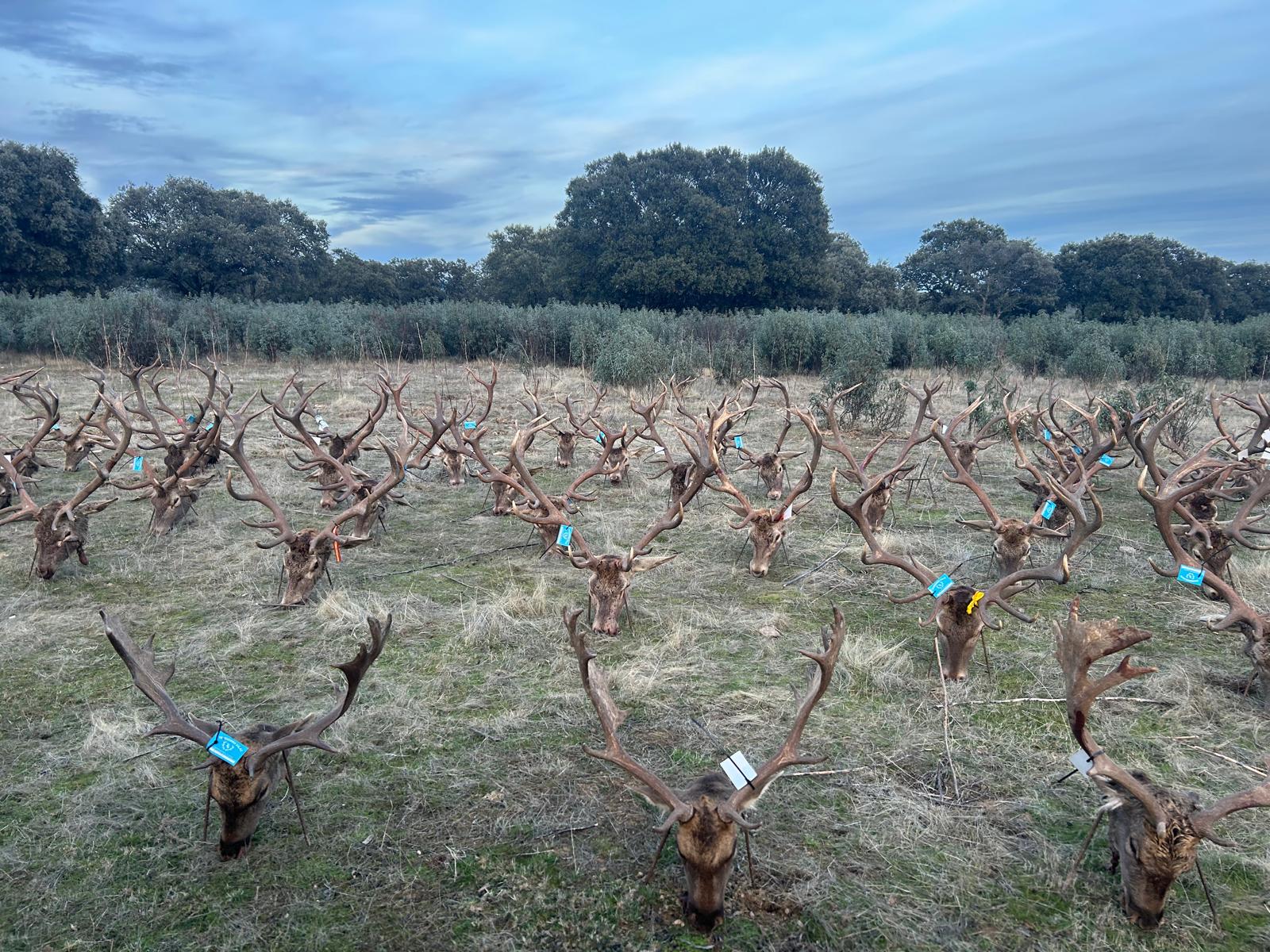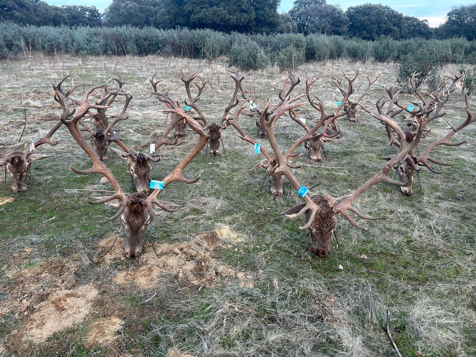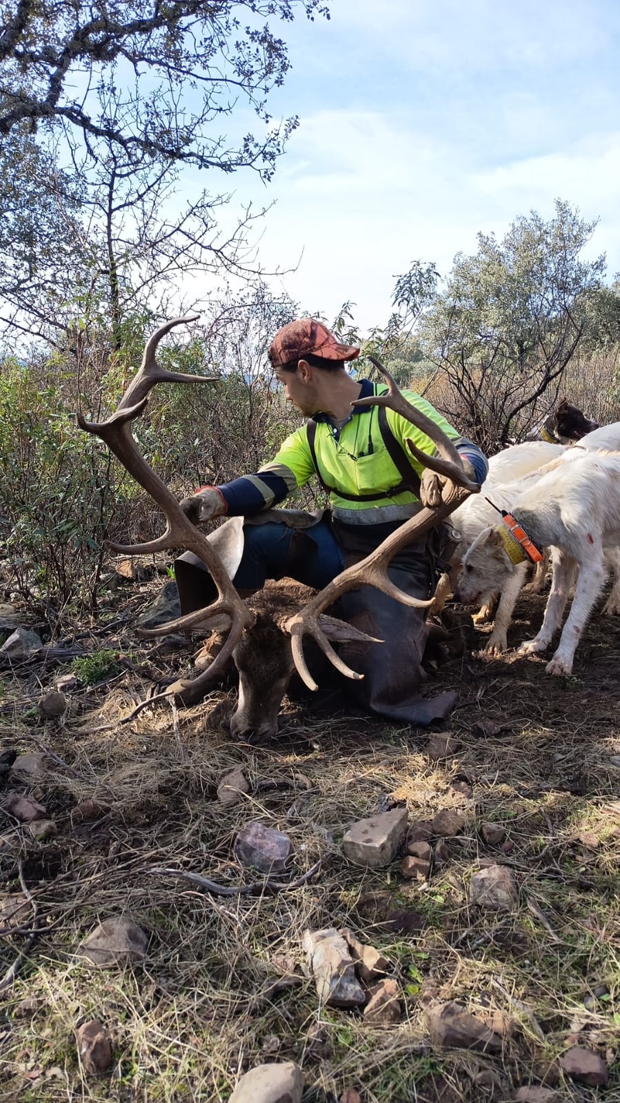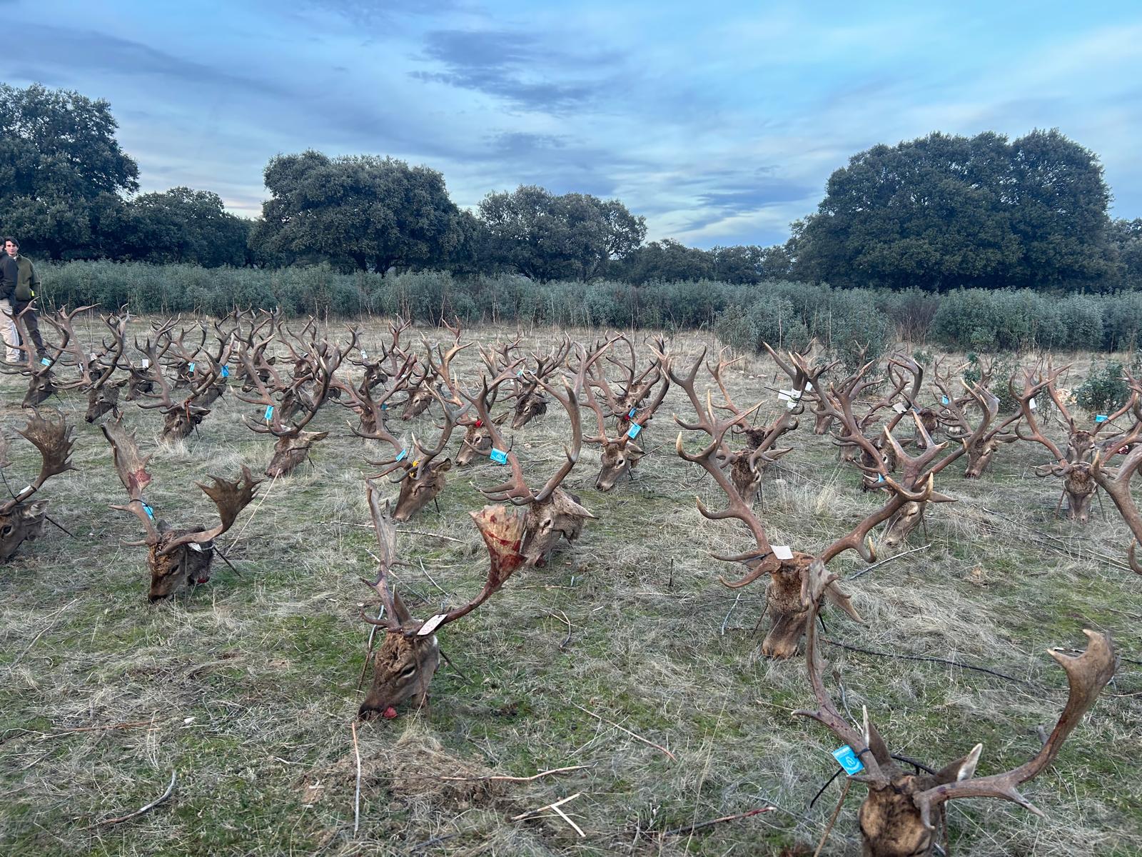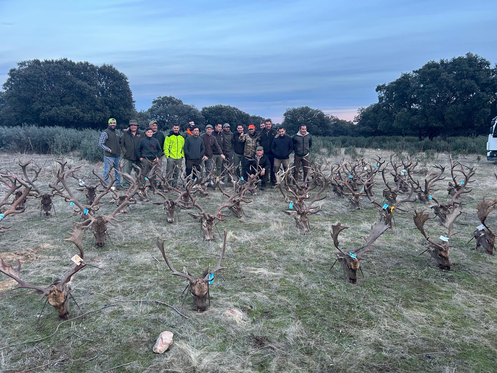Día magnífico para el monteo, mañana trepidante de carreras y lances y un plantel que habla por si solo: 51 venados, 8 gamos y 2 jabalíes entre los 28 puestos, que a cupo de 2 machos se batían hoy el cobre con las reses montunas de este afamado coto.