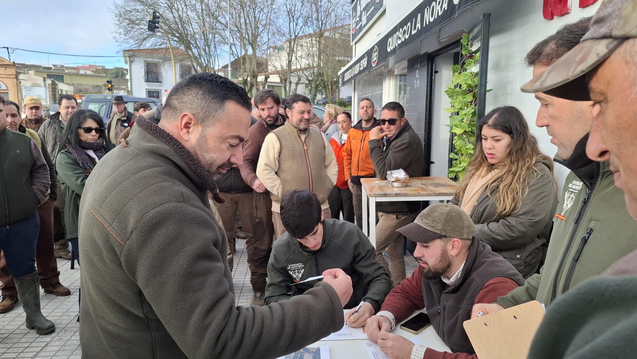Convocaban Enrique y Leoncio a los 48 monteros que cubrirían la mancha a cazar a las 8:30h de la mañana en el bar La Báscula de esta localidad pacense, para desayunar y realizar el sorteo de puestos, que en esta ocasión se volvió a realizar por armadas para comenzar a cerrar la mancha lo antes posible.