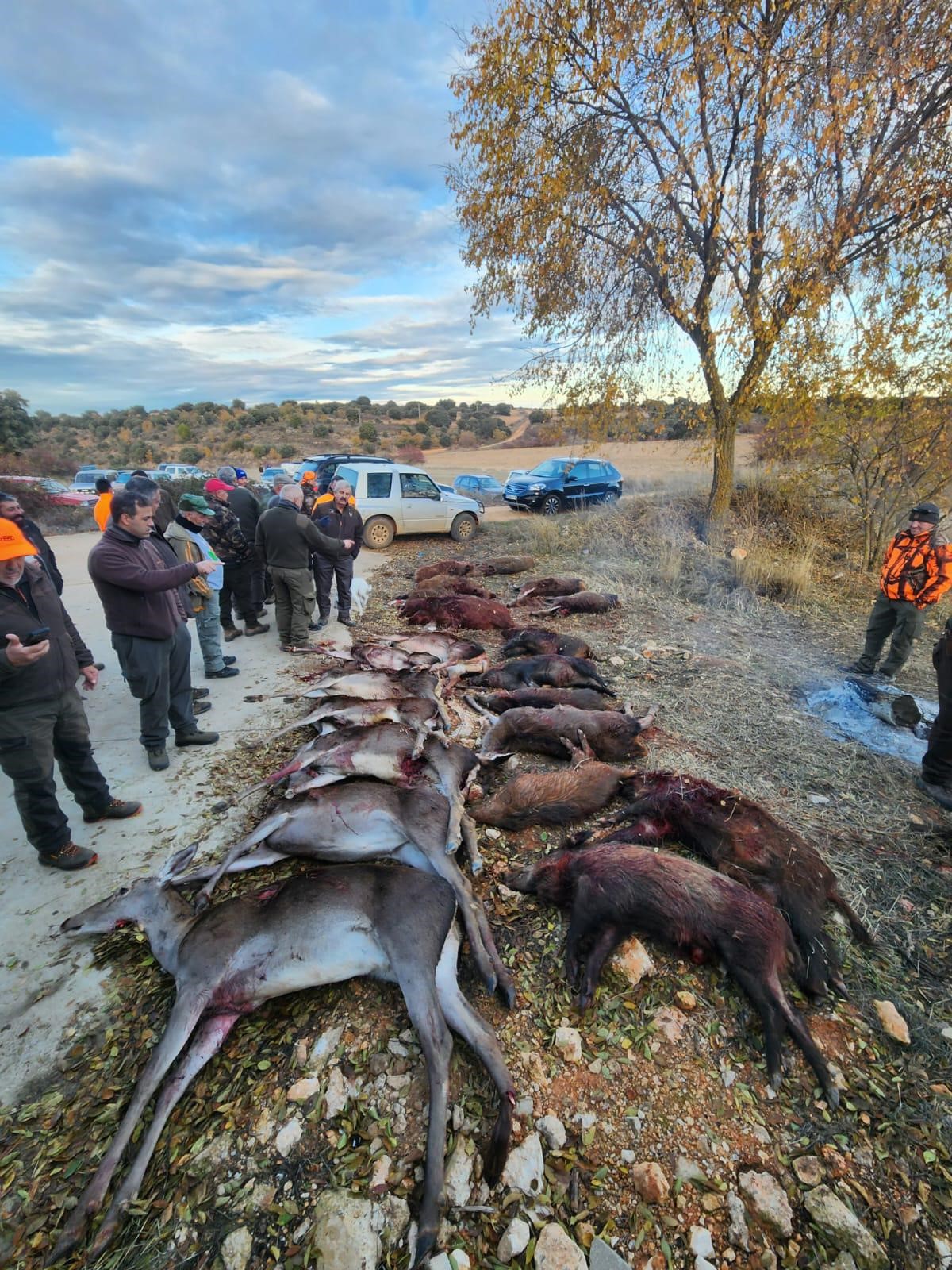 Ciento cuarenta tiros se contaron en cuatro horas de ladras y reses que cruzaron el bosque, simplemente espectacular. Increíble el número de corzos que nos pasaron por los puestos con su grácil saltar y esa mirada entre sorpresa y curiosidad. Treinta reses en el plantel. Aquí se aprovecha todo -es matacuelga- y algunos desollan sus piezas y el resto a la cárnica. Mientras, Jean Piero (que es responsable del único bar del pueblo, El Viejo Horno) nos agasaja con unas judías con chorizo y oreja, un magro de cerdo con tomate, natillas, vino, café y copa. Le ayudan su amigo Manolo y su mujer Valentina, que se hace cargo, ella sola, de atender el bar y es un lio de verdad. Jean Piero, no nos extraña que el resto de pueblos de la comarca te estén pidiendo que les sirvas el catering para sus monterías, pero recuerda: ¡el 21 de noviembre de 2026 está ya reservado para la próxima montería de San Andrés del Rey!.