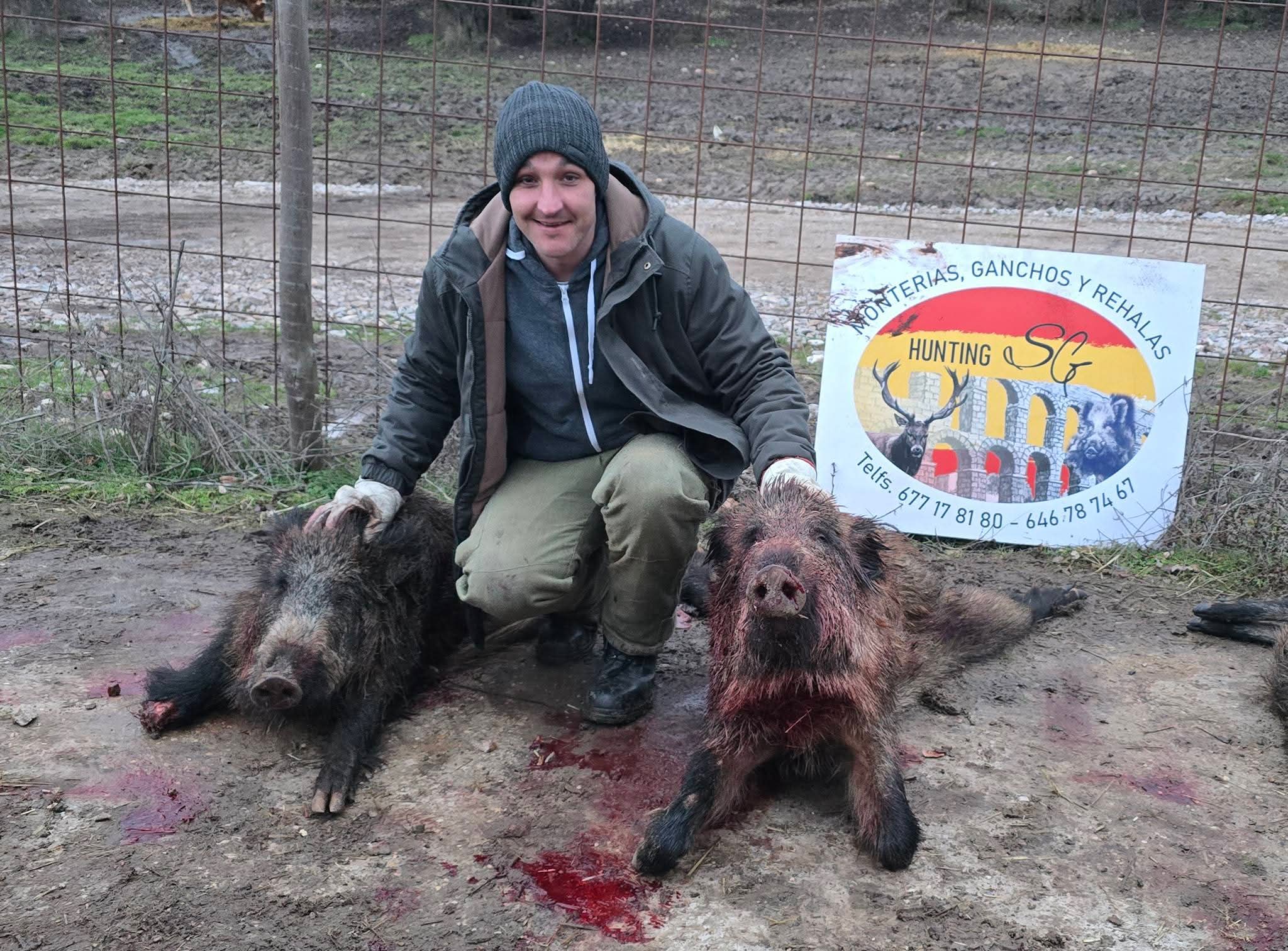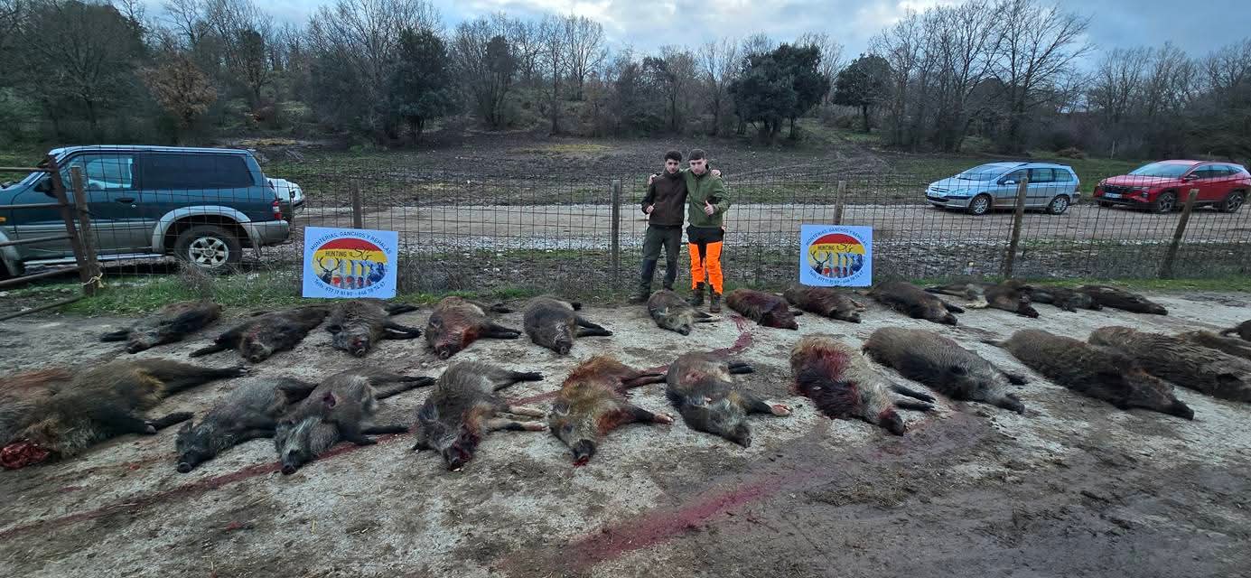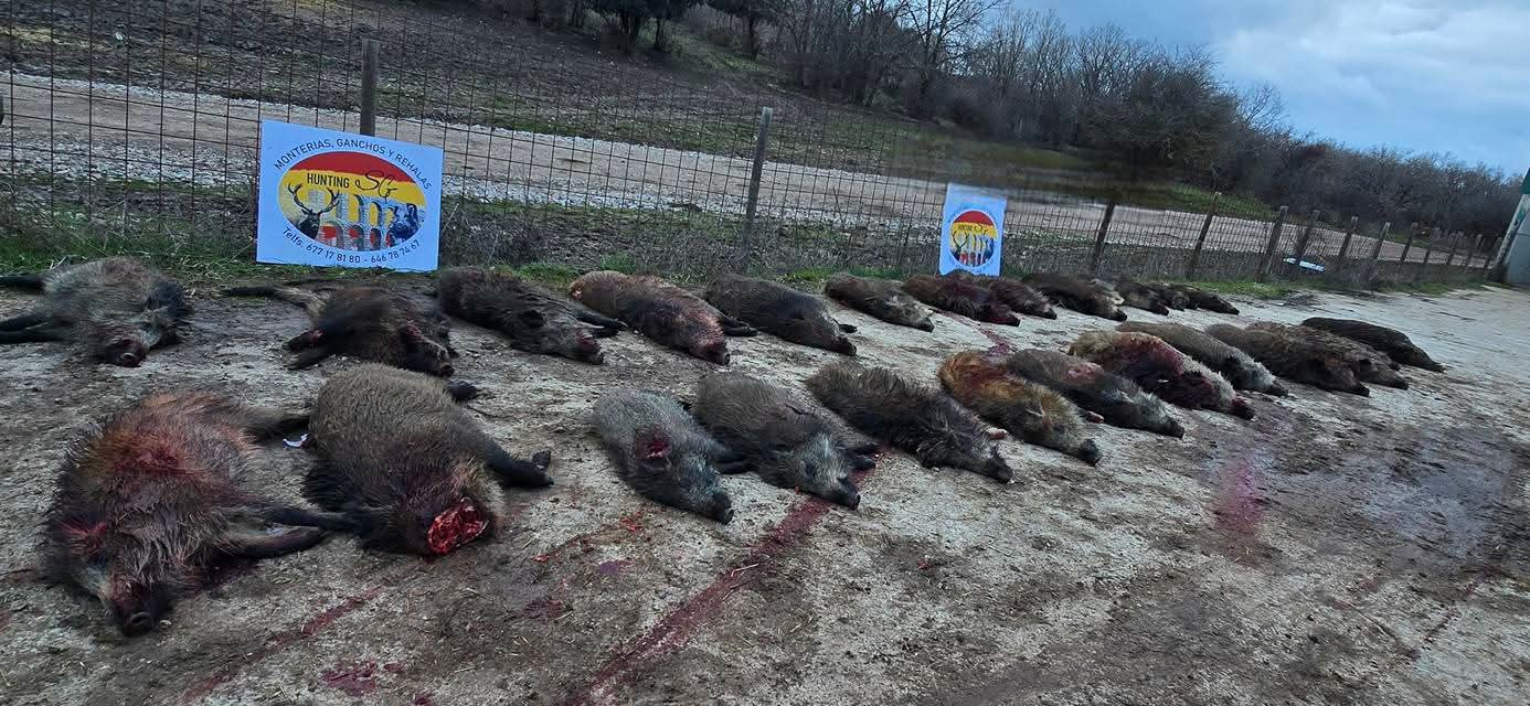 La montería llega a su fin y es hora de recoger. Nos encontramos con un puesto de 8 jabalíes cobrados. Resultado final: 27 jabalíes cobrados, más 6 de los perros.