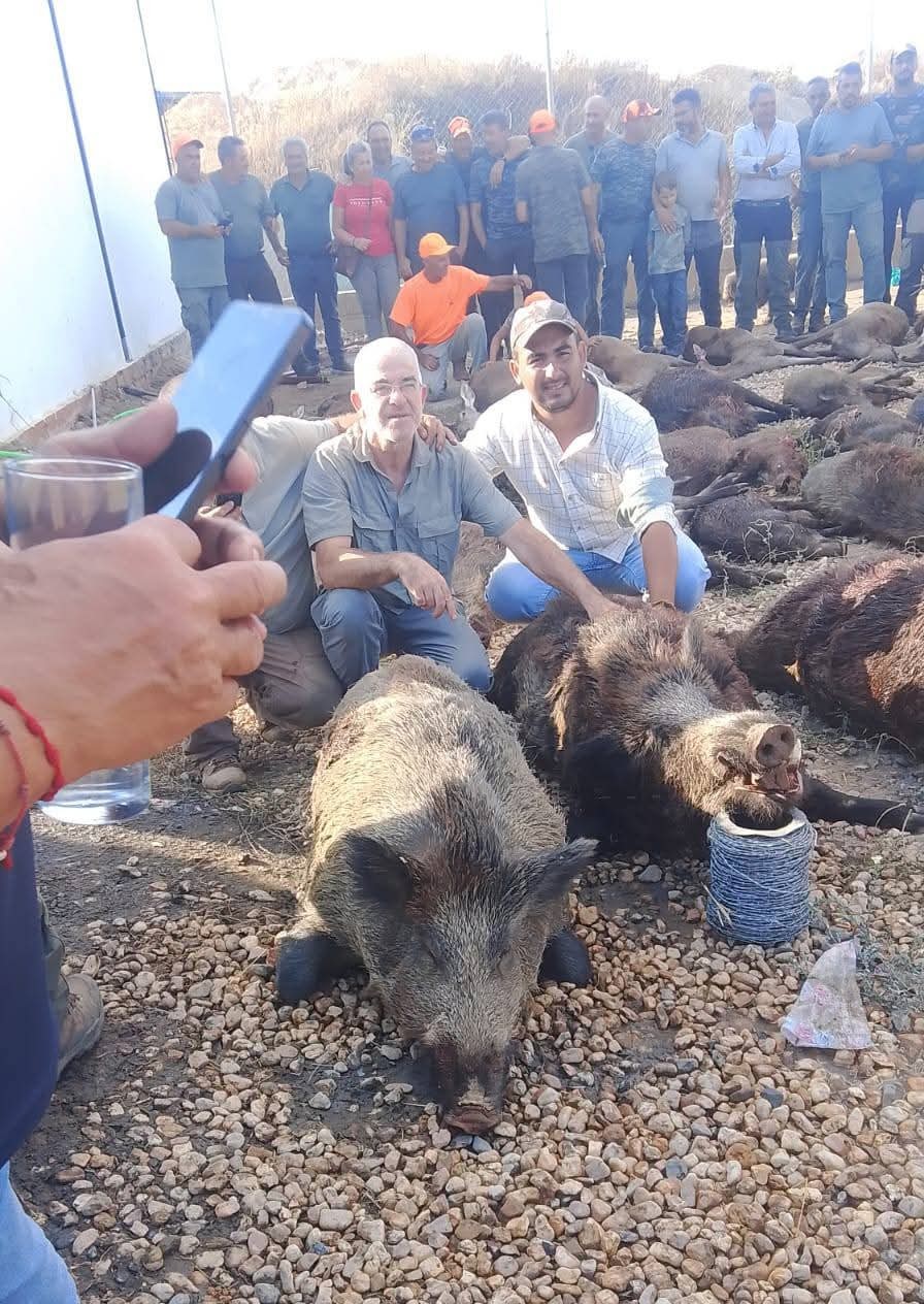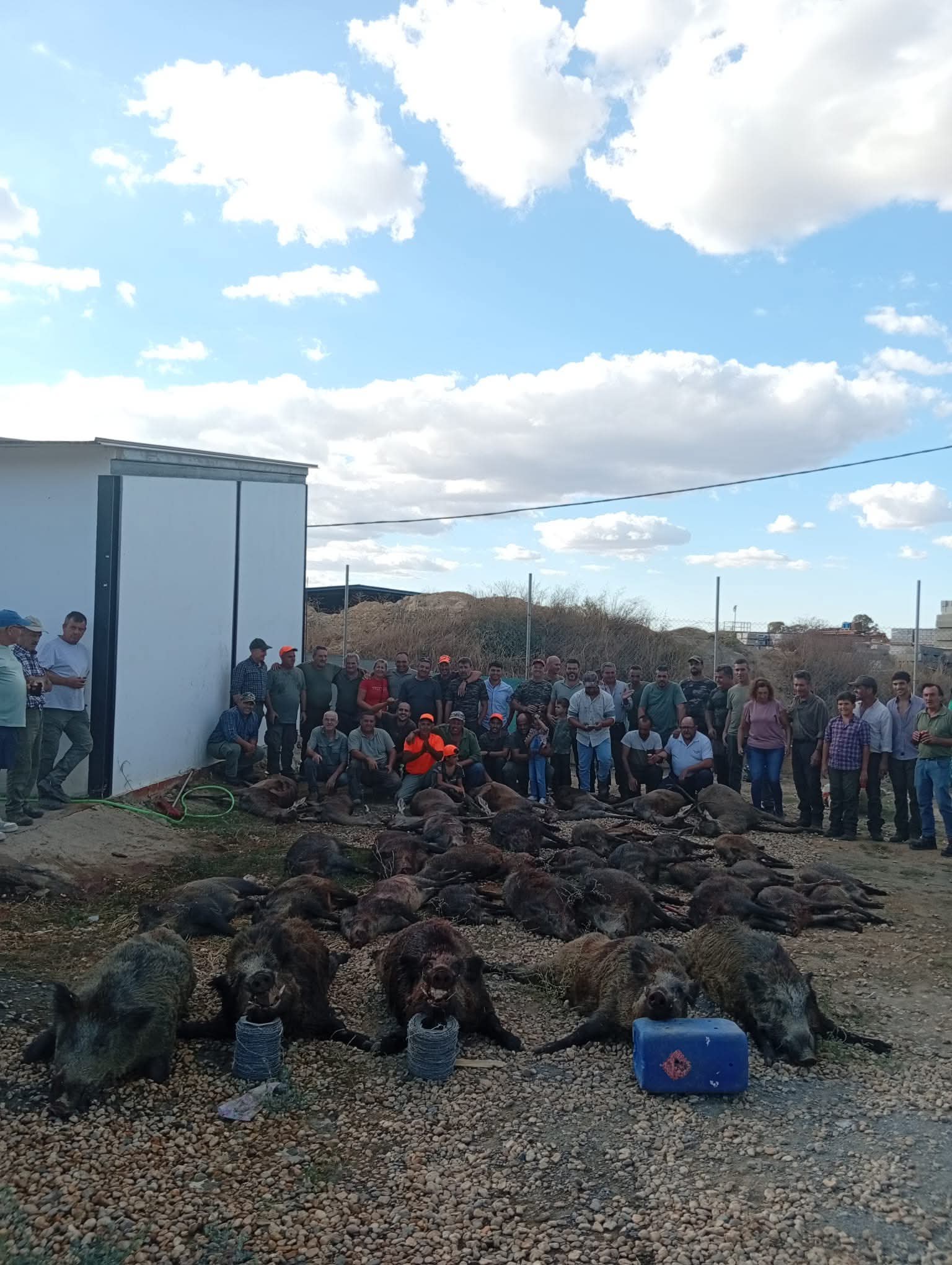 Una vez los cazadores habían vuelto a disfrutar de la comida que nos esperaba, era hora de sacar los jabalíes abatidos del monte, y llevarlos a la Junta de Carnes, esta vez en el Campo de Tiro. La recogida fue bastante rápida, y pronto estábamos todos juntos disfrutando de capturas y viandas. Al final la montería fue un rotundo éxito. La jornada se saldó con un total de 29 jabalíes capturados con 41 Puestos, un magnífico comienzo de temporada.