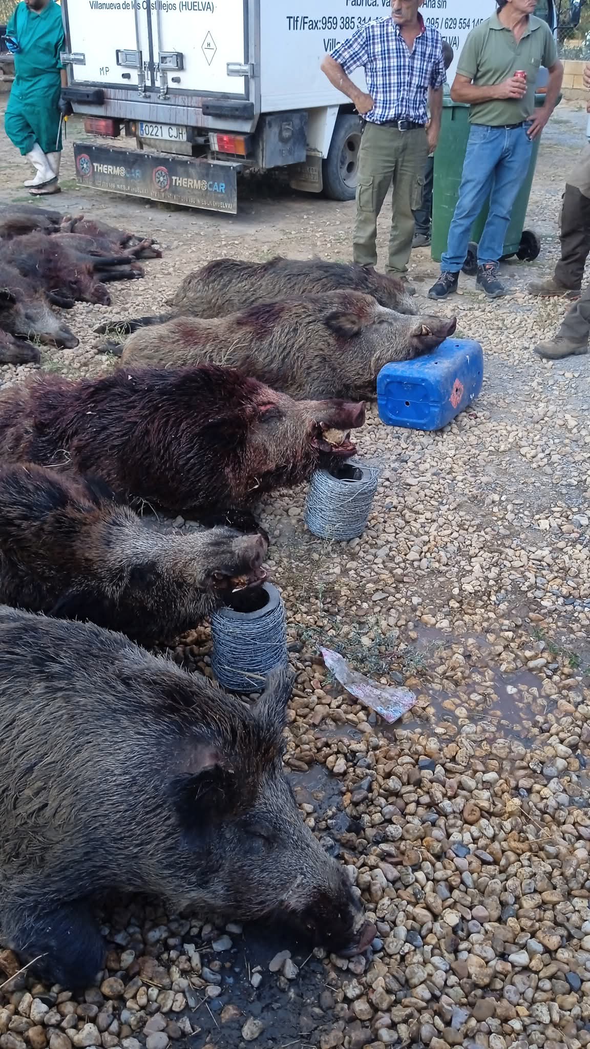 Como una sopa fueron llegando los cazadores a la casa para disfrutar de la comida mientras la organización sacaba al plantel diez de los diecinueve jabalíes abatidos, siendo prácticamente imposible recuperar nueve de ellos en el fondo del barranco y en la ribera del Chanza.