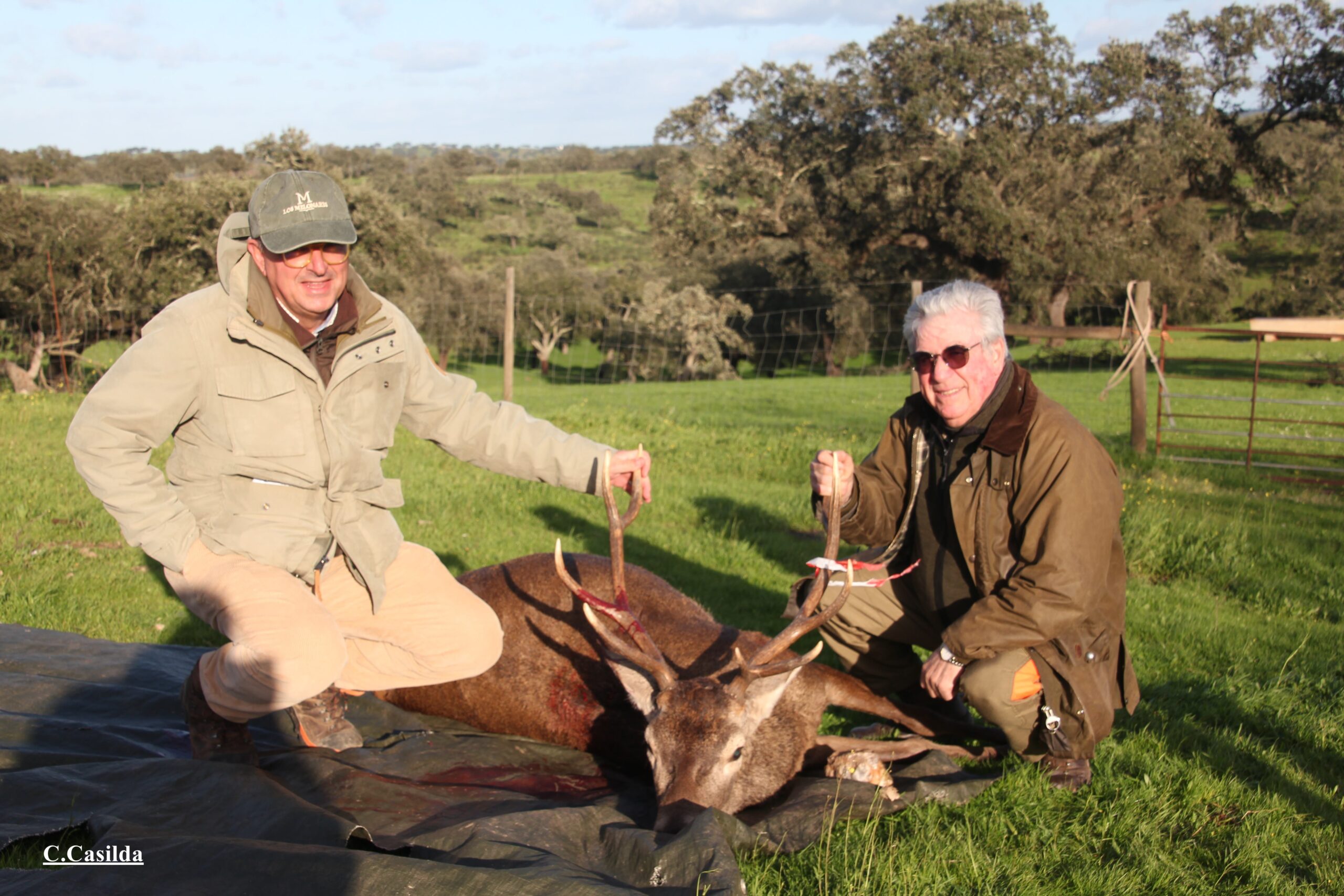 La familia del dos sobre las cuatro menos cuarto hacía dos disparos, y al poco me veo aparecer un venado que venía derechito a mi postura. Quedé petrificado esperando que se arrimase lo máximo posible, pero, tocado de una pata trasera, no le gustó la figura del coche y decidió torcerse buscando las bajeras de las encinas, entre las que le solté hasta cuatro salves, continuando su camino casi con más salud de la que traía. Finalmente, sería abatido en el uno del cierre de conejo que tenía además otros dos jabalíes cobrados.