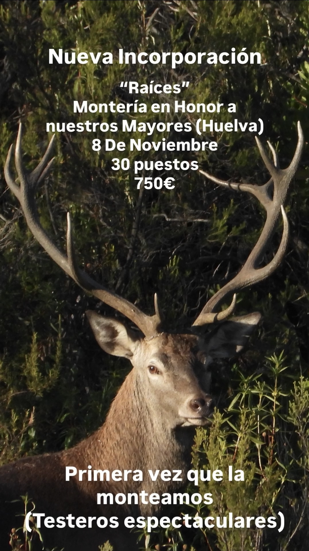 Por un lado el 8 de noviembre dará en Huelva la montería RAÍCES, jornada en Honor a nuestros Mayores, donde cazará la mancha de La Umbría con 30 puestos y 30 animales de garantía entre venados y jabalíes.