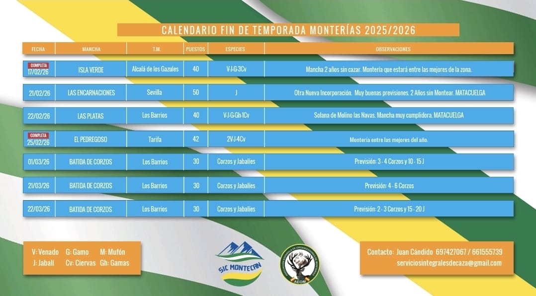 SERVICIOS INTEGRALES DE CAZA MONTECAN acaba de publicar la última actualización de su calendario tras las las suspensiones que por causas meteorológicas ha tenido que hacer y la publicación oficial de la prórroga de la temporada de monterías en Andalucía hasta el 28 de febrero para atender a todas estas jornadas suspendidas por los temporales de lluvia.