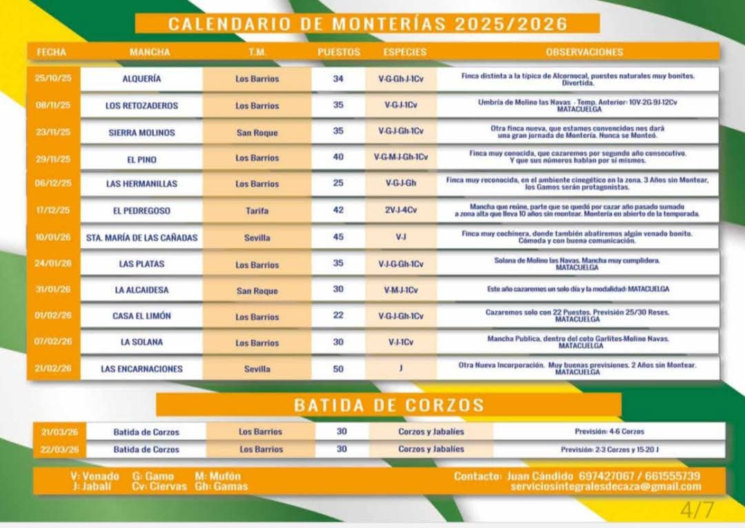 Se trata de una mancha ubicada en Los Barrios que ya cazaron el pasado año con notable éxito y que este año lleva el objetivo de mejorar el resultado de 3 venados, 8 gamos, 2 muflones, 25 jabalíes (3N) y 37 hembras que se cobraron entre los 42 monteros. Este año se montea con 40 puestos a cupo libre de venado, gamo, gama, muflón y jabalí, más 1 cierva por puesto.