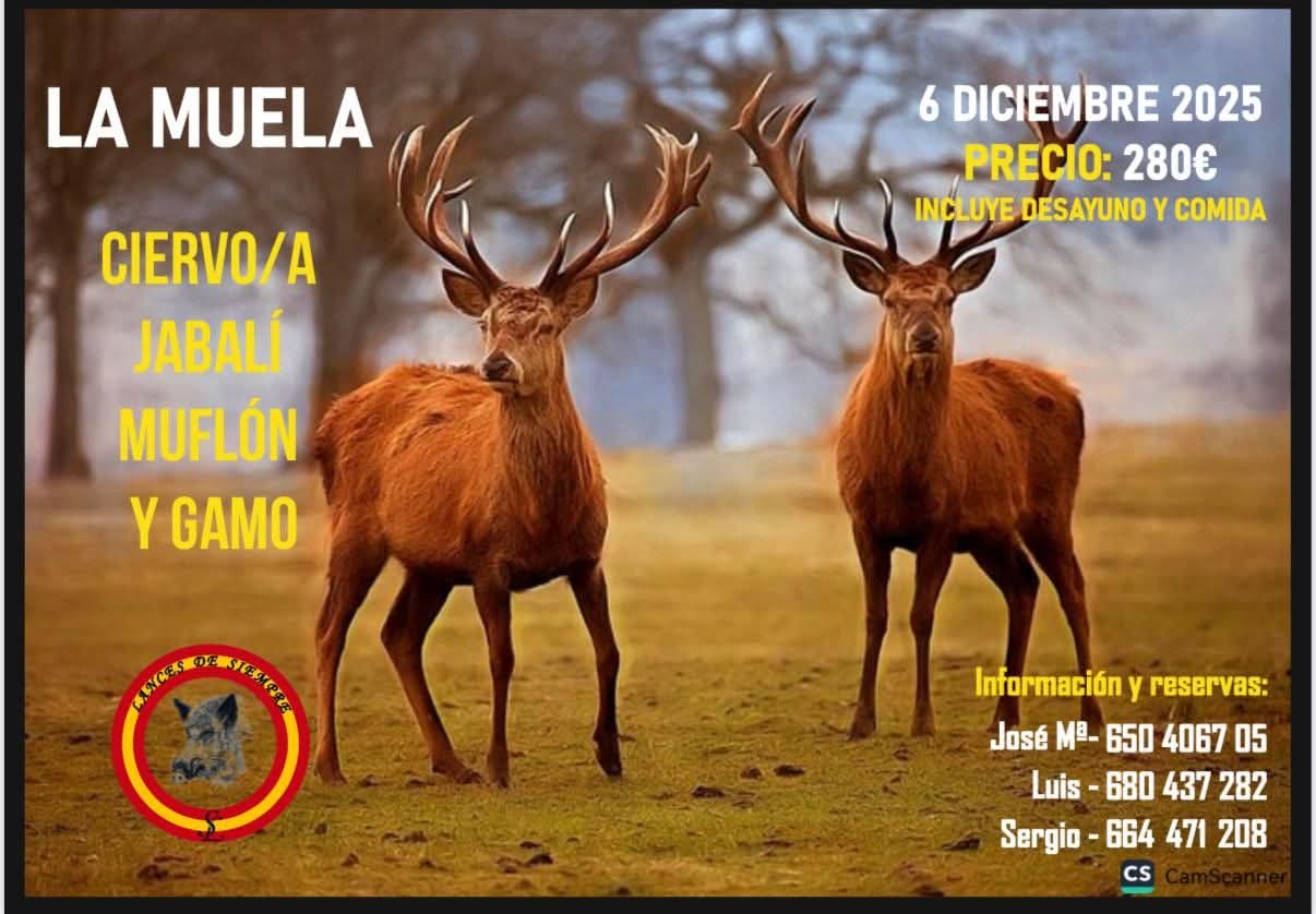 La próxima cita a la que la organización nos anima a participar es el 6 de diciembre en la finca LA MUELA, en Albacete, montería que se cazará sin cupo a venado, gamo, muflón, jabalíes y ciervas, y que seguro nos dará grandes satisfacciones y dejará sobre el plantel un buen número de trofeos bonitos, de lo que gustan abatir en abierto.