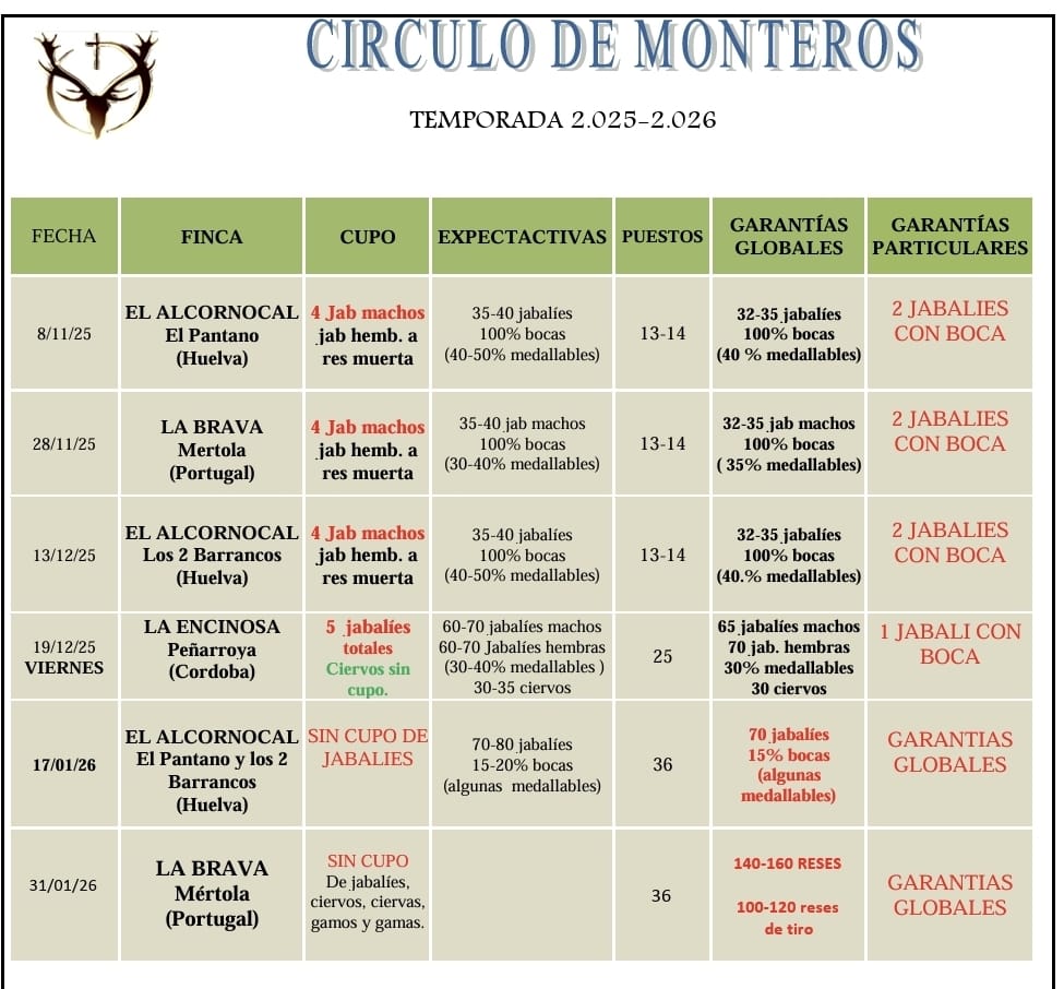 CÍRCULO DE MONTEROS está a punto de completar todo su calendario 2025-2026. Tanto es así que tan sólo le quedan algunos puestos en la montería de EL ALCORNOCAL 17 de ENERO y de LA BRAVA 31 de ENERO, las dos últimas jornadas del programa que van a demás sin cupo en ambos días.
