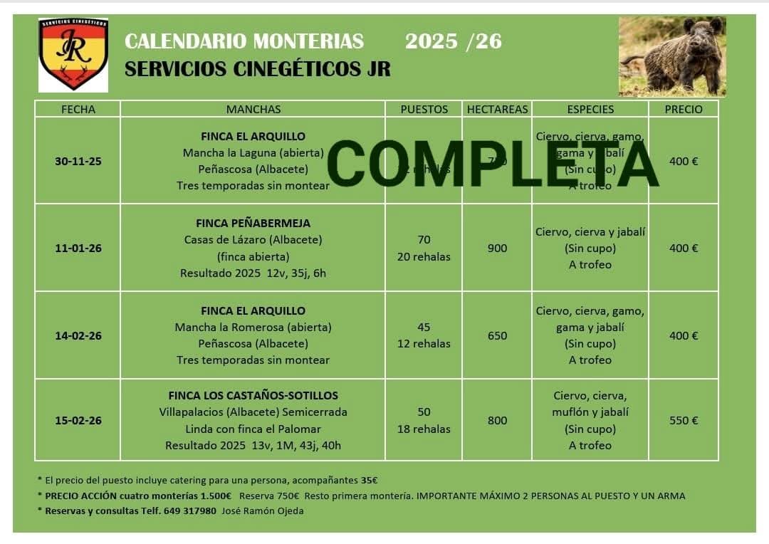 Completada la montería del próximo 30 de noviembre en El Arquillo, José Ramón Ojeda, máximo responsable de Servicios Cinegéticos JR, nos ofrece los 15 últimos puestos de la montería que dará el 11 de enero en la finca PEÑABERMEJA, en Casa de Lázaro (Albacete), mancha muy cochinera donde el cervuno también da mucho juego a las escopetas.