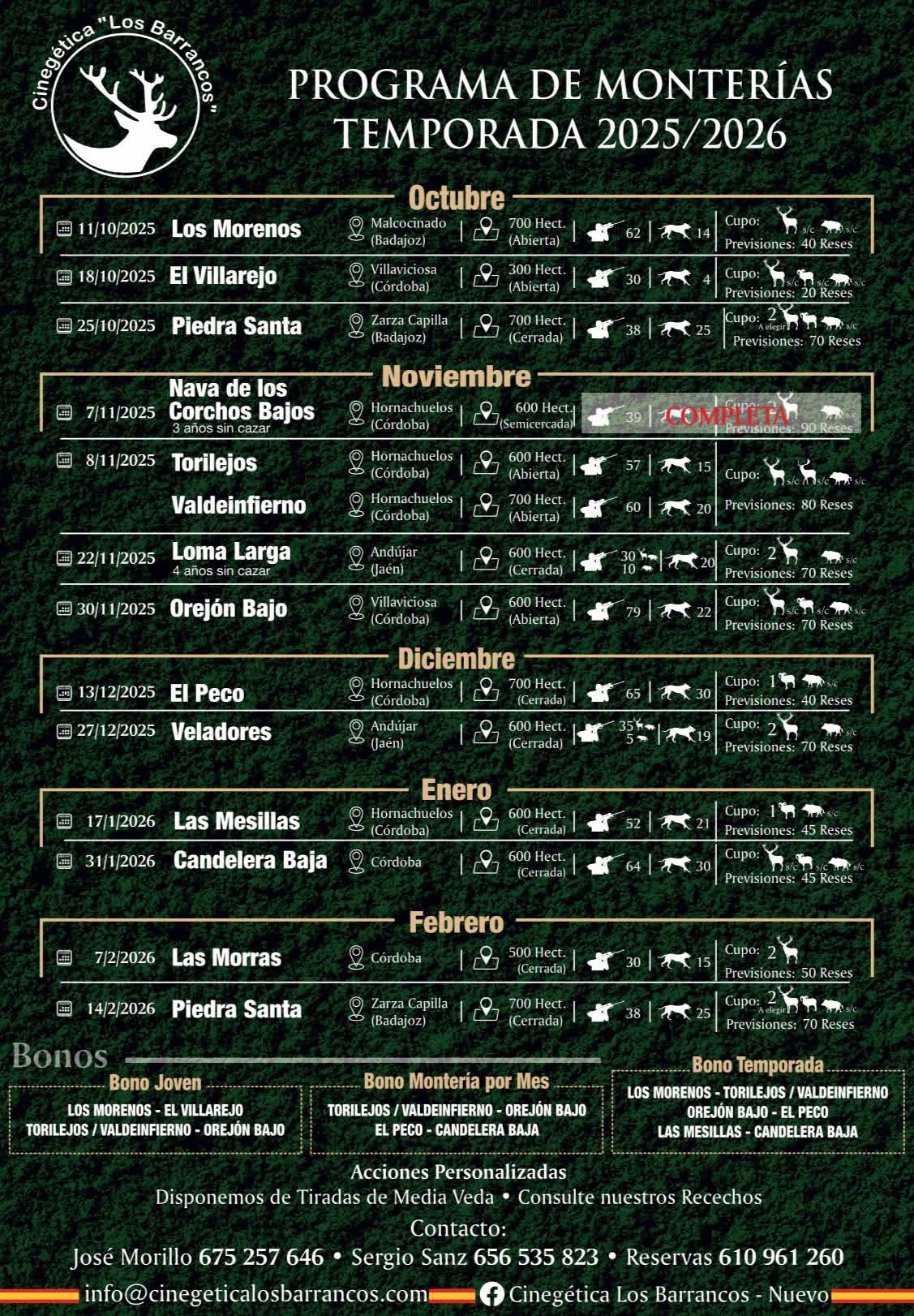 Ya queda menos para la gran montería que CINEGÉTICA LOS BARRANCOS dará el 8 de noviembre en Torilejos y Valdeinfierno, fincas abiertas ubicadas en el término municipal de Hornachuelos, Córdoba, que este año vuelven a cazarse conjuntamente convirtiéndose en una de las grandes monterías en abierto de la sierra cordobesa esta temporada.