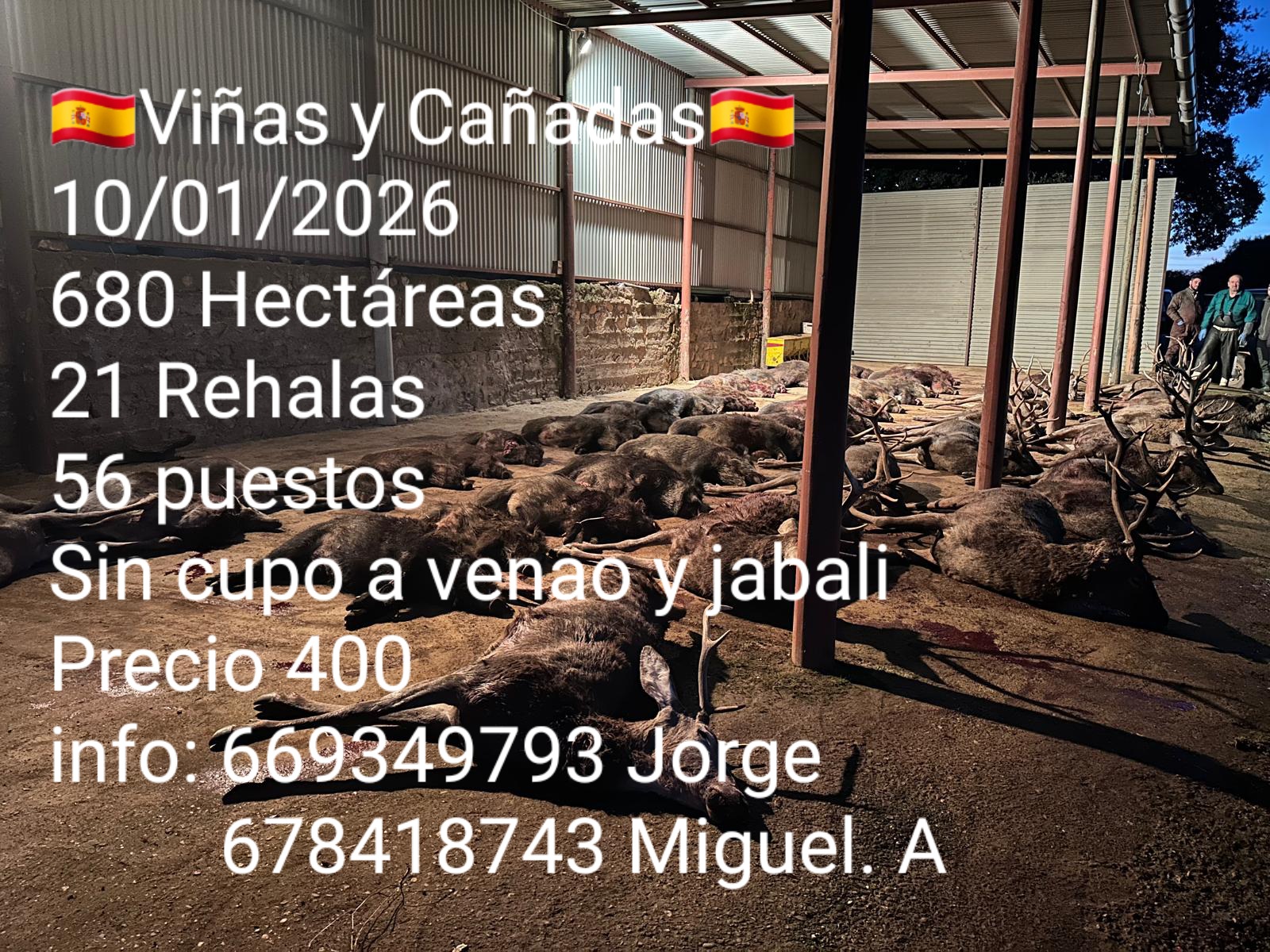 Para este viernes 9 de Enero la organización de Jorge Muñoz y Miguel A. Rincón caza la primera de las dos monterías que la empresa tiene anunciada en LAS NAVAS DE SAN EUSEBIO, finca cercada que tras 2 años sin cazar vuelve al circuito comercial con un amplio cupo de 2 venados, 1 muflón, 3 cochinos, 2 ciervas y 3 muflonas, por lo que la diversión está garantizada. Precio: 2.350€